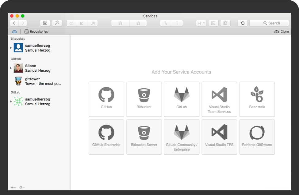 GitHub,Bitbucket,GitLab……以及其他受欢迎的服务(例如Azure DevOps和Beanstalk)与Tower完美协作