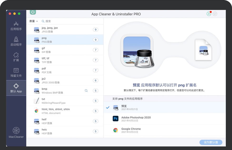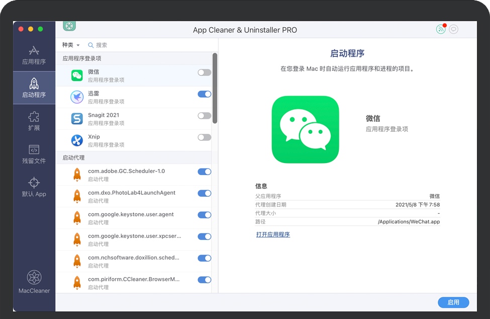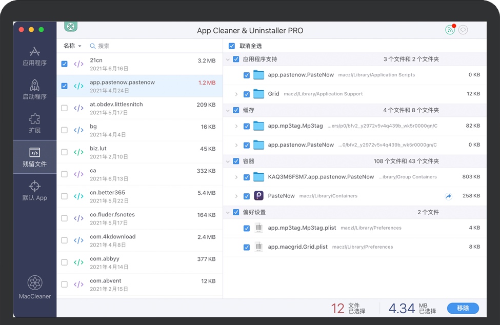 App Cleaner & Uninstaller Pro for Mac 是一款用于完全安全地删除Mac上的应用程序的工具,不会留下任何遗留。该程序查找应用程序的服务和临时文件以及已删除的应用程序的剩余部分,允许您更改和禁用登录项,管理Mac扩展,清理和卸载Mac应用程序。