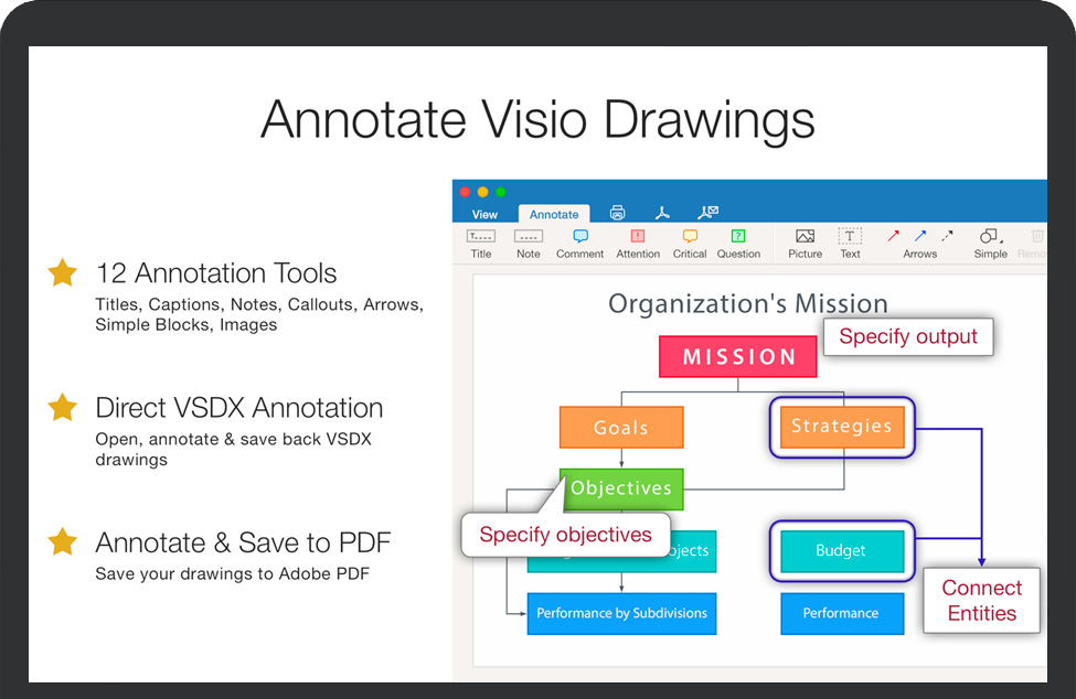 在Mac上打开Visio绘图以VSD/VDX/VSDX文件格式打开和预览任何MS Visio绘图。导航多页文件,查看形状数据、超链接、指南和注释。 | 在Mac上注释Visio文件VSDX Annotator不仅仅是一个文档阅读器,它还提供有用的功能,例如添加注释、流程图和任何图形文件。 | 文件保存为.vsdx或.pdf将修改后的文件保存为 .vsdx 或将它们转换为更常见的 PDF 格式。通过电子邮件以 PDF 格式发送文件或使用菜单栏打印它们。 |