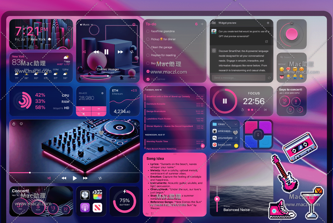 使用 WidgetWall 将您最常用的工具放在桌面上,即可快速访问各种 Mac 应用。添加多个时钟和天气小部件、Mac 统计信息等等。