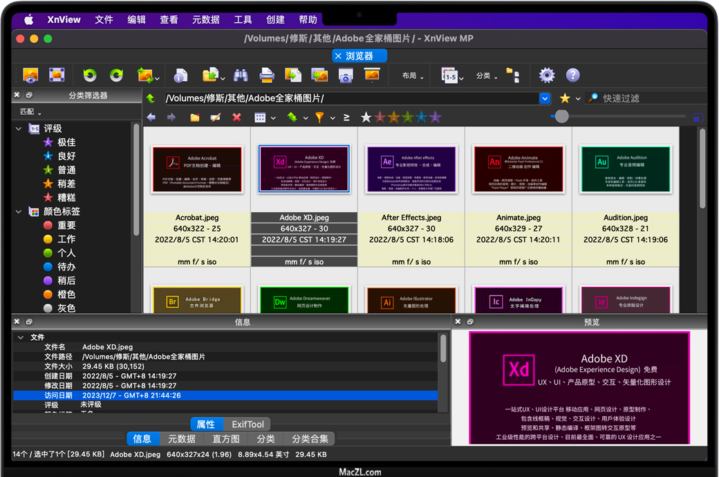 XnViewMP for Mac是一款多功能且功能强大的照片浏览器、图像管理、图像缩放器。 XnView 是最稳定、易于使用且功能全面的照片编辑器之一。支持所有常见的图片和图形格式(JPEG、TIFF、PNG、GIF、WEBP、PSD、JPEG2000、OpenEXR、相机 RAW、HEIC、PDF、DNG、CR2)。