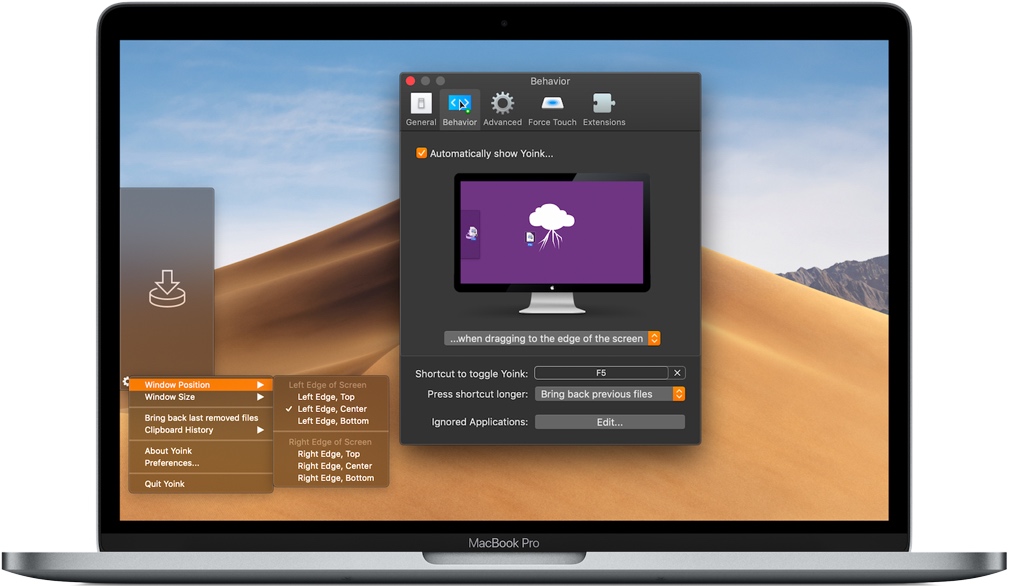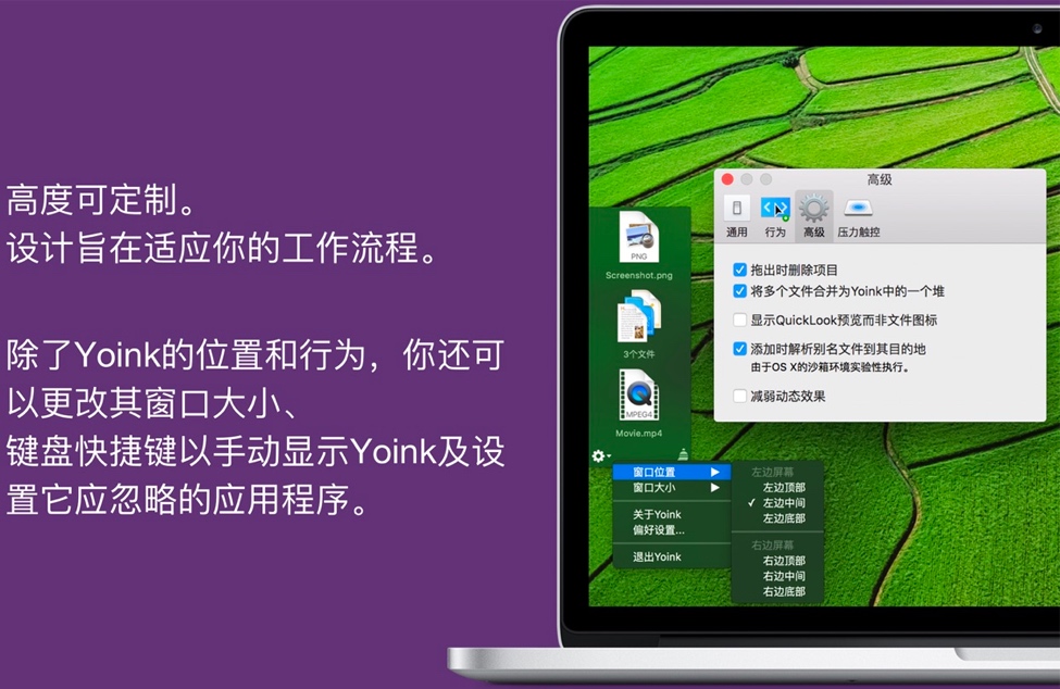 这是你的架子,所以你可以把它放在任何地方。在 Yoink 菜单中,调整窗口大小-从最小到最大。接下来,从六个选项中选择Yoink在屏幕上的最佳位置。您还可以在首选项 → 行为中定义何时显示Yoink的条件。