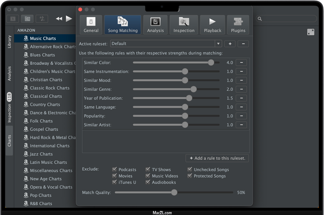 MatchList是iTunes智能播放列表和Genius的混合体。不遵循硬规则,而是用两首种子歌曲和一组软规则创建匹配列表。