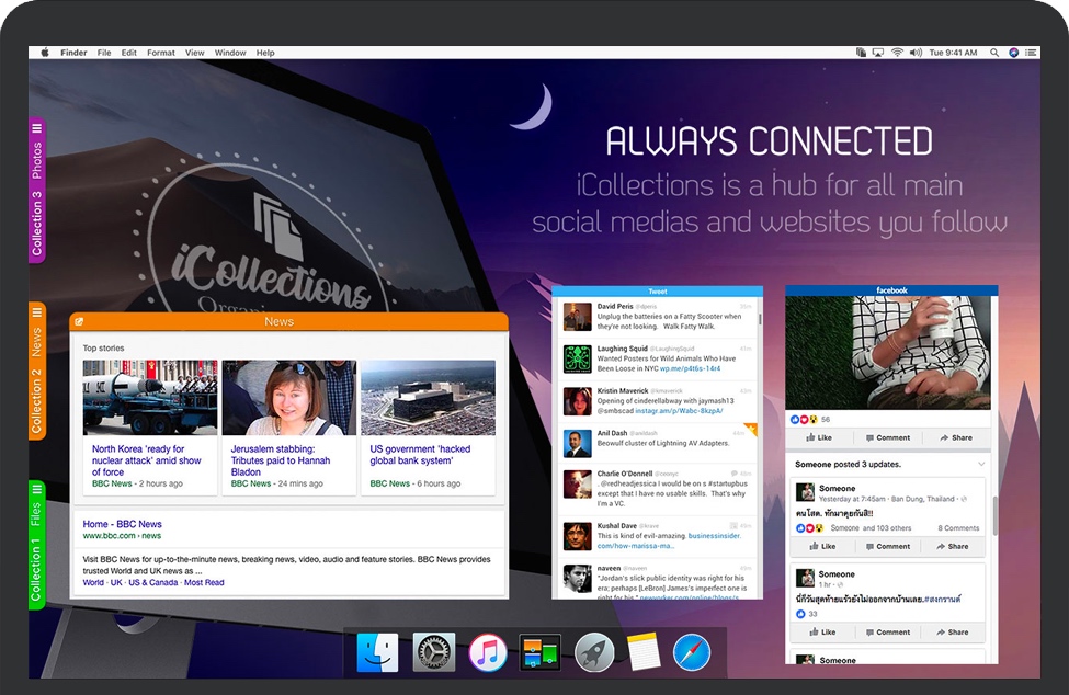 | 从主菜单中选择相框,在桌面上创建相框。相框将以幻灯片形式显示您的图片集,例如每天新图片。只需选择您的图片文件夹或Photos©应用相册,即可重温您最精彩的时刻。 在桌面上显示您最喜爱的网站-Facebook、YouTube、Twitter、新闻或您选择的任何其他网站。 iCollections不仅提供了一种在桌面上动态存储文件和文件夹的方式,而且还提供了一个精简的桌面,让一切都井井有条,从而提高任务和时间管理效率。 主要功能