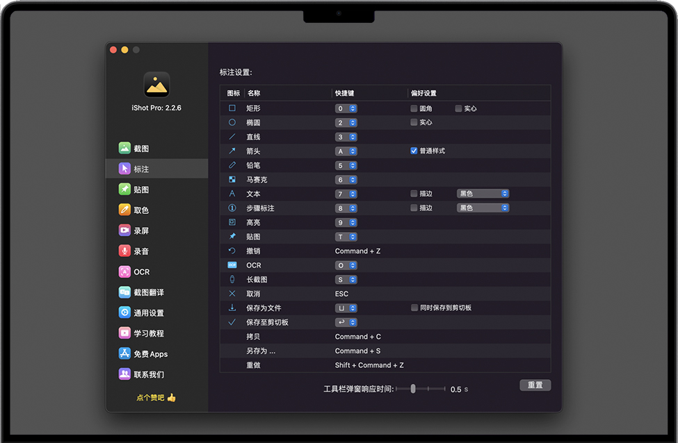 iShot为每个标注功能都提供了快捷键,而且是单按键的快捷键,使用快捷键,可直接切换标注工具,无需点下面的标注按钮。另外还可根据个人习惯更改标注快捷键。