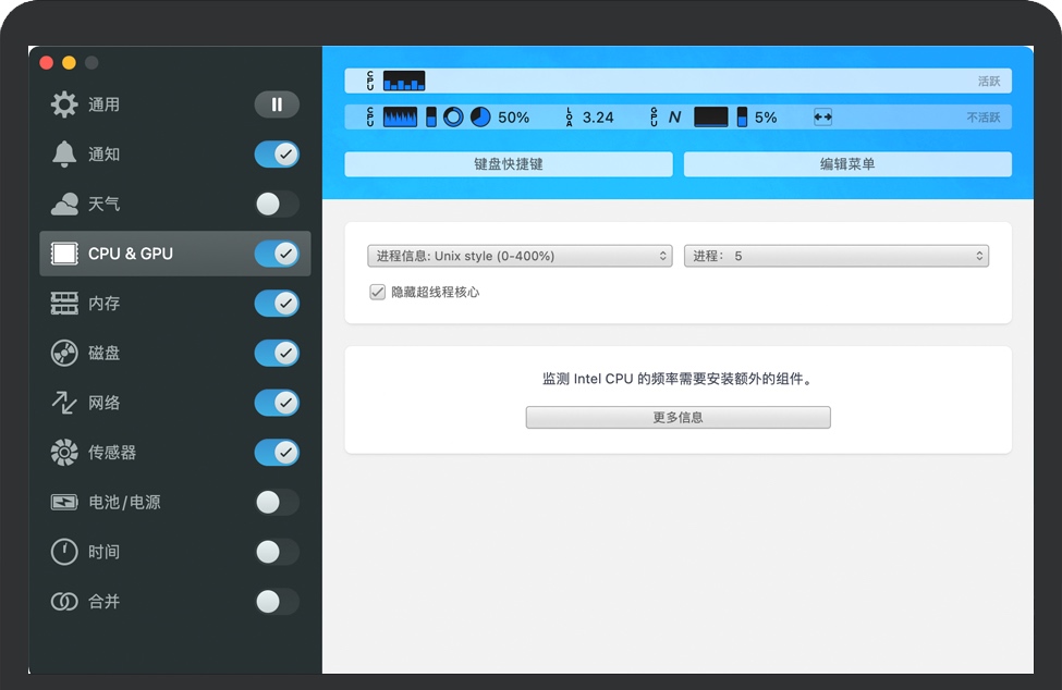 GPU历史记录菜单栏项目•新的CPU圆形菜单栏图表,内存和磁盘