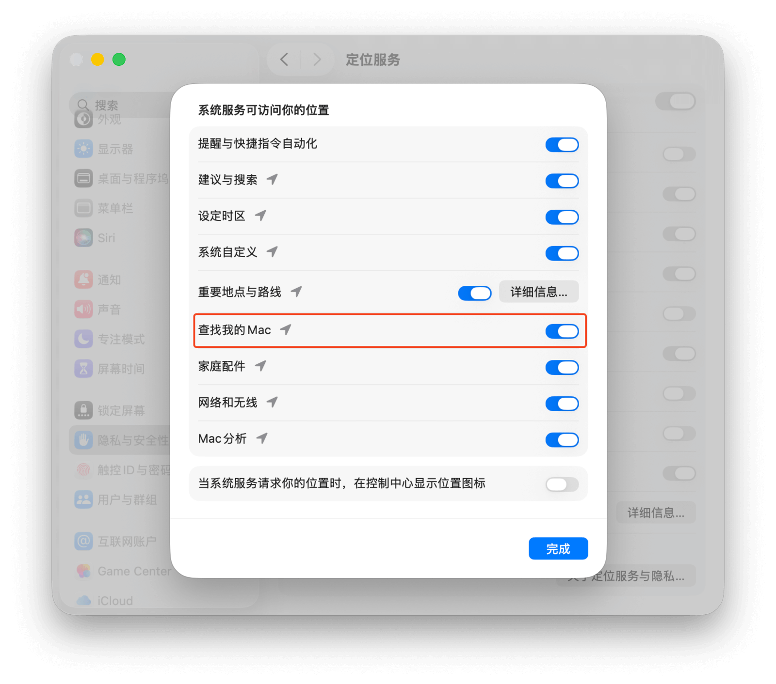 2. 前往「系统设置 > 隐私与安全性 > 定位服务」,确保「定位服务」的总开关已打开,并允许「查找」应用使用定位服务。这样才能在地图上查看设备的位置。