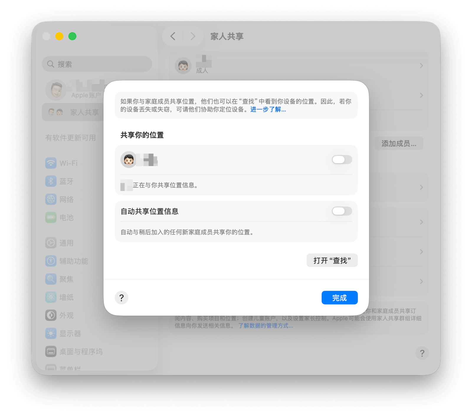 如果你设置了 Apple「家人共享」,可以在「系统设置 > 家人共享 > 位置共享」中选择与家人分享你的位置。设置完成后,你就可以在「查找」应用的「设备」标签页中看到家人的设备位置。