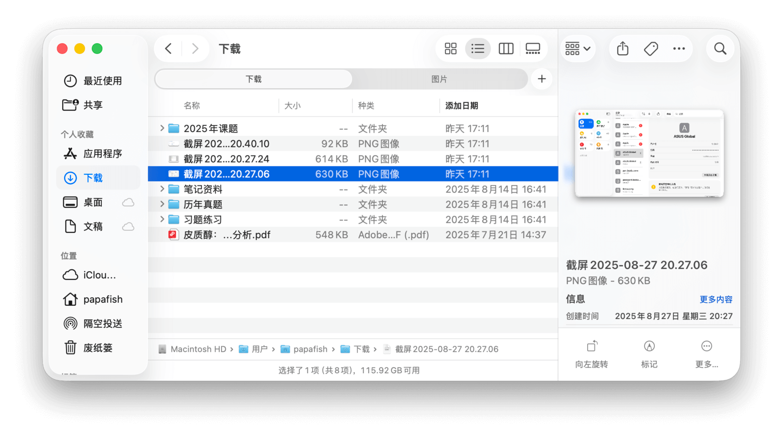 状态栏:显示当前文件夹的项目数量、选中项目信息以及 iCloud 剩余空间等,位于路径栏下方。
