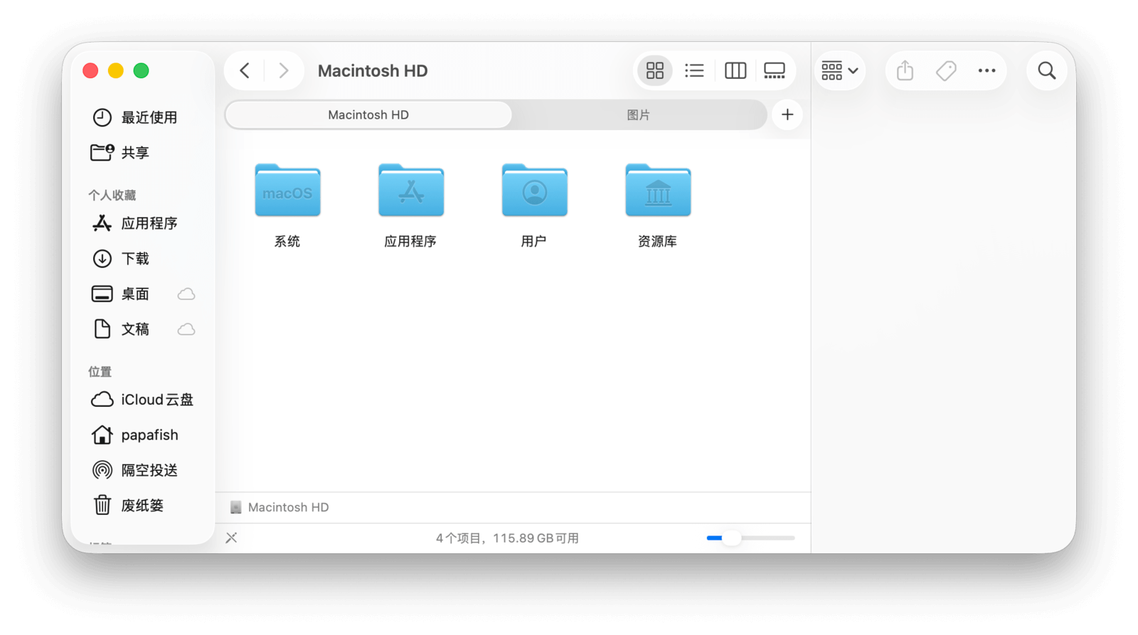 「Macintosh HD」中主要包含四个文件夹:系统、应用程序、用户和资源库。严格来说,「Macintosh HD」下只包含「系统」和「用户」两大文件夹。「应用程序」和「资源库」文件夹其实位于「系统」文件夹内,但为了方便访问,「访达」将它们并列显示。