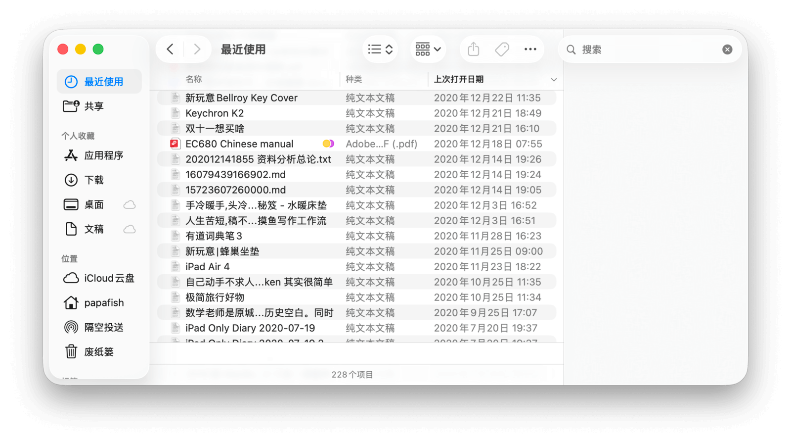 智能文件夹能自动聚合电脑中所有符合条件的项目,但它本身不占用实际磁盘空间,里面的文件仍在原位。边栏中的「最近使用」其实也是一个智能文件夹,方便用户快速找到最近打开过的文件。