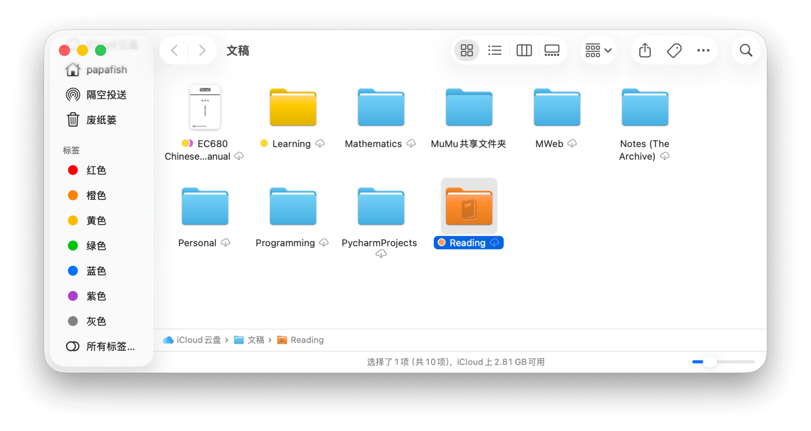 在「访达」边栏的「iCloud」类别下,可以找到「iCloud 云盘」,这里存放着所有储存在 iCloud 中的文件。