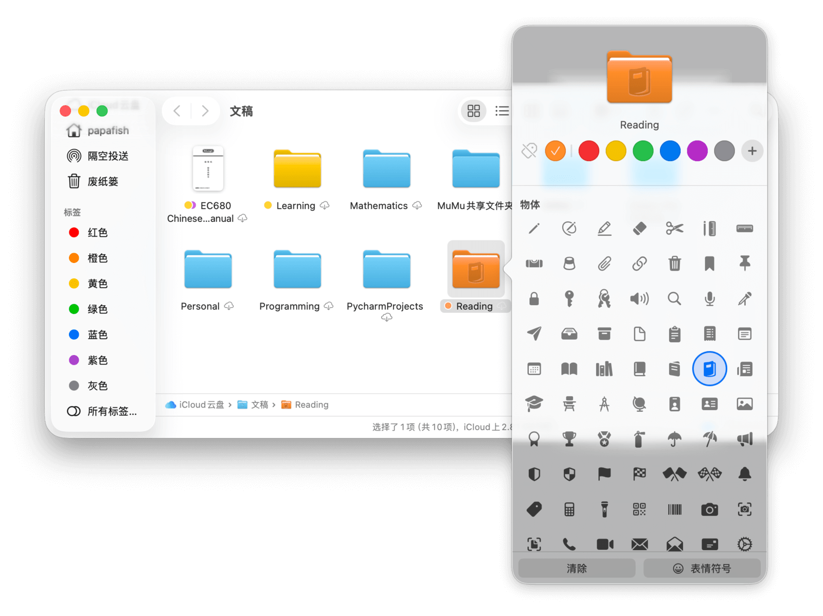 除了通过标签颜色区分文件夹,我们还可以直接更改文件夹的图标。在 macOS Tahoe 版本中,通过右键菜单的「自定义文件夹」选项,可以为文件夹添加矢量徽章、表情符号和特殊符号等图标,让文件夹的用途一目了然。