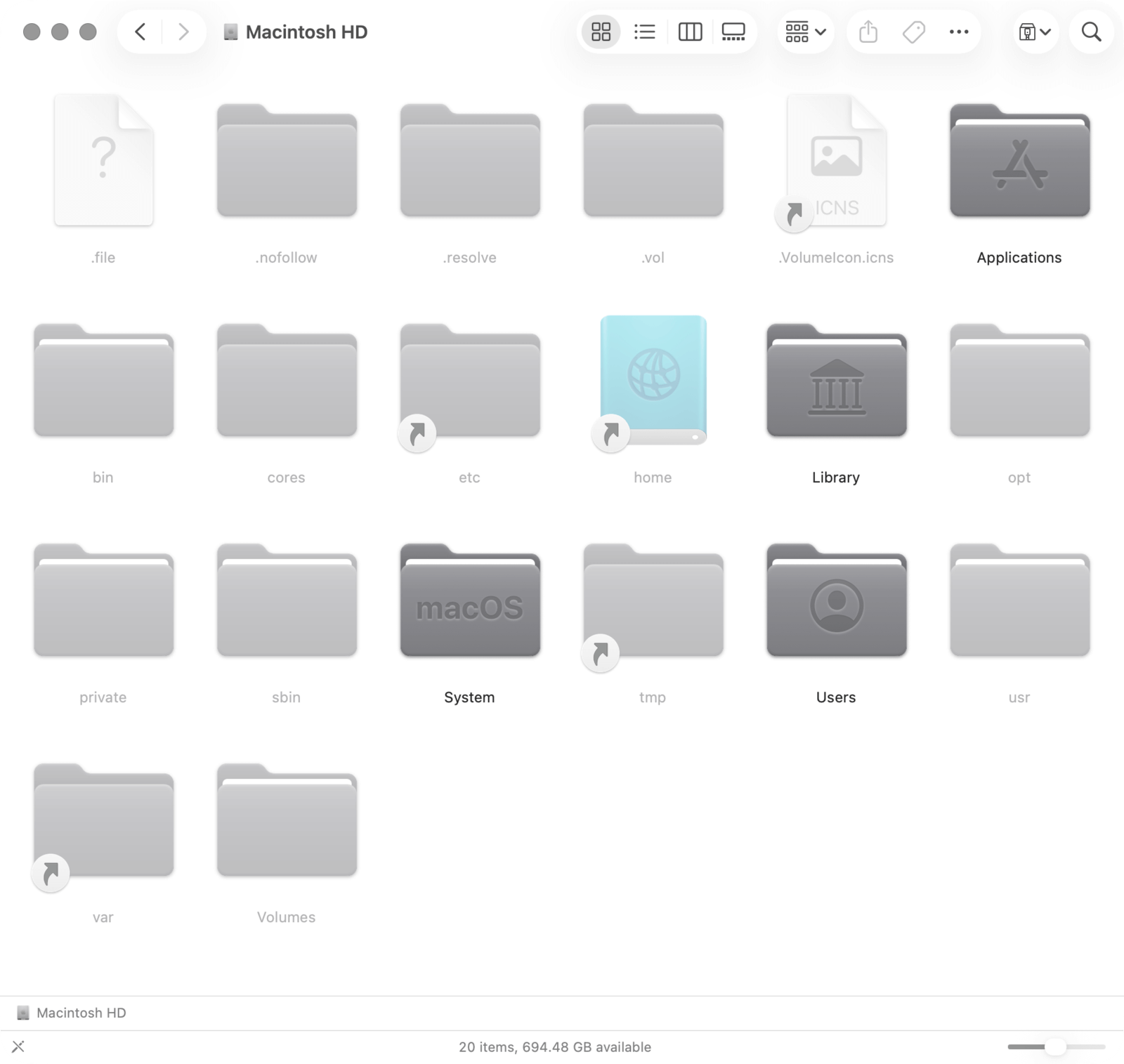 打开「访达」的「设置」→「边栏」,确认「位置」部分下的你的 Mac 名称(例如「MacBook Pro」)已被勾选。然后点击边栏上你的 Mac 图标,再点击硬盘图标(通常名为「Macintosh HD」),就进入了 macOS 文件系统的根目录。