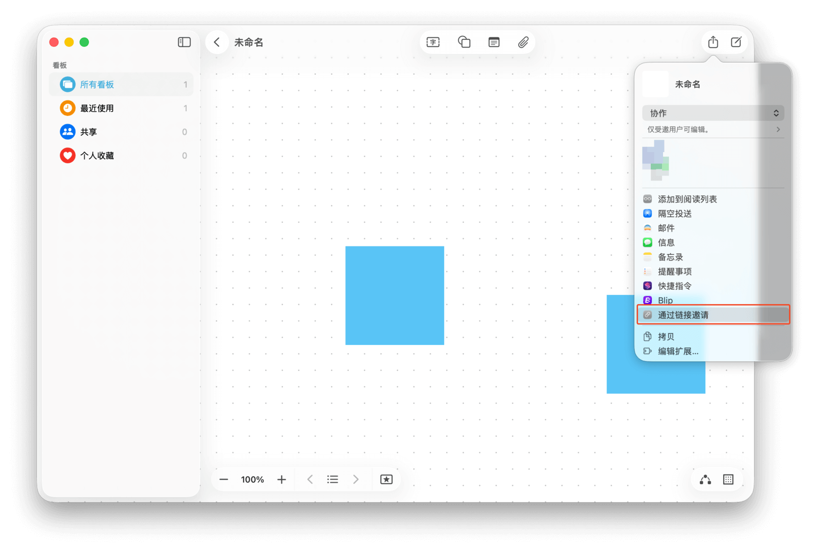 同样,在使用前请确保已在「系统设置 > Apple ID > iCloud」中启用无边记。然后,在任意画布的右上角找到分享按钮,就可以通过信息、邮件等方式邀请协作者加入当前的画布。
