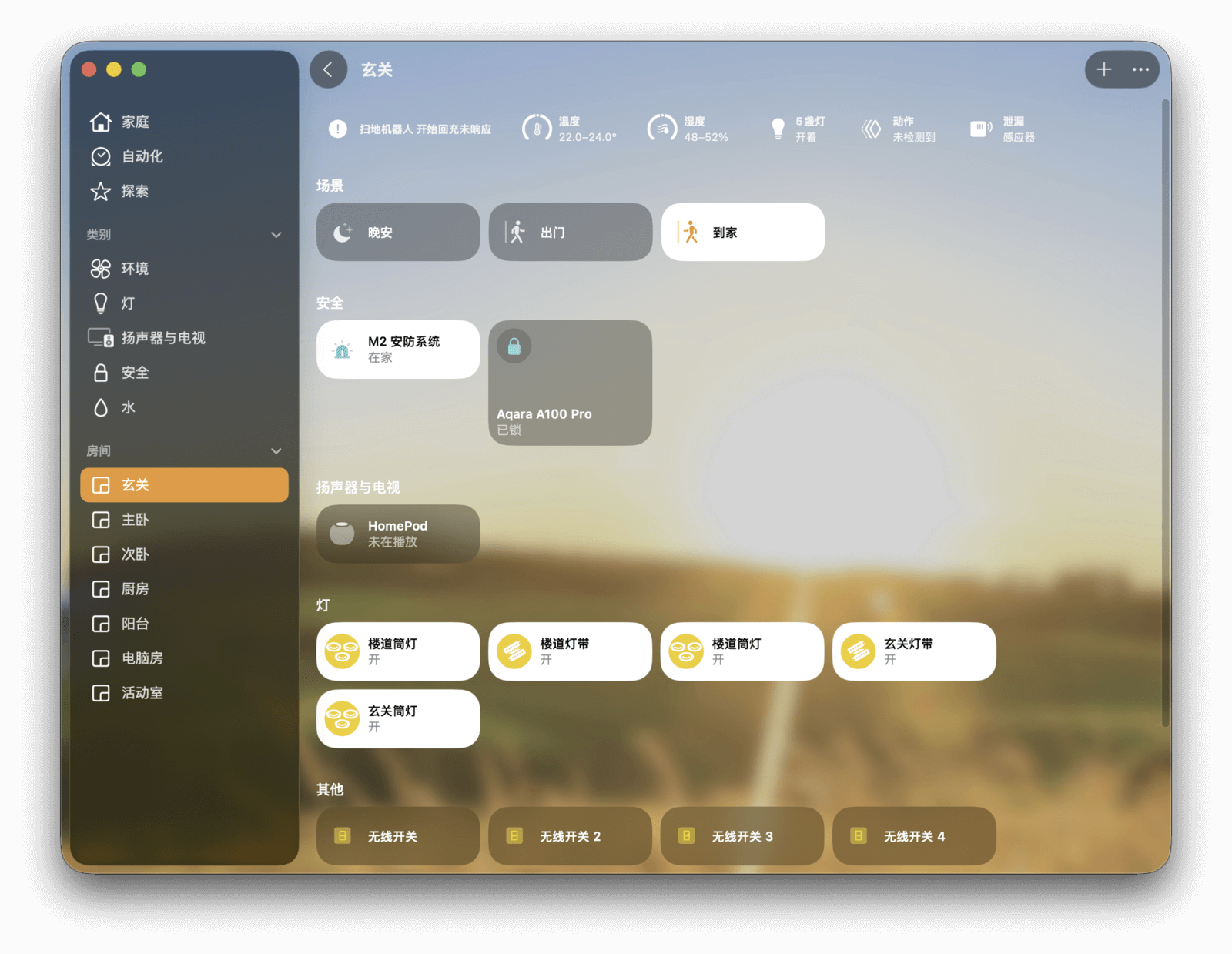 在 macOS 13 及之后版本中,家庭 app 的界面采用了全新的设计风格,从以往的底部标签页改成了侧边栏,令浏览、整理、查看和控制各种配件更加轻松简单。