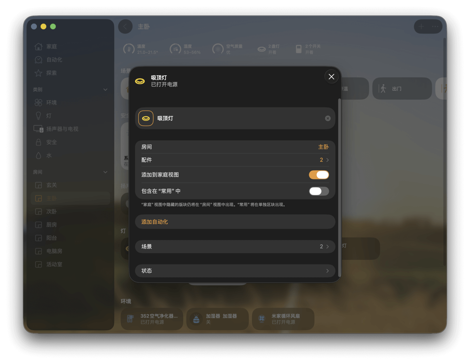 最后是「房间」分组。这里的信息与「家庭」页面类似,但只显示特定房间内的所有设备和场景。