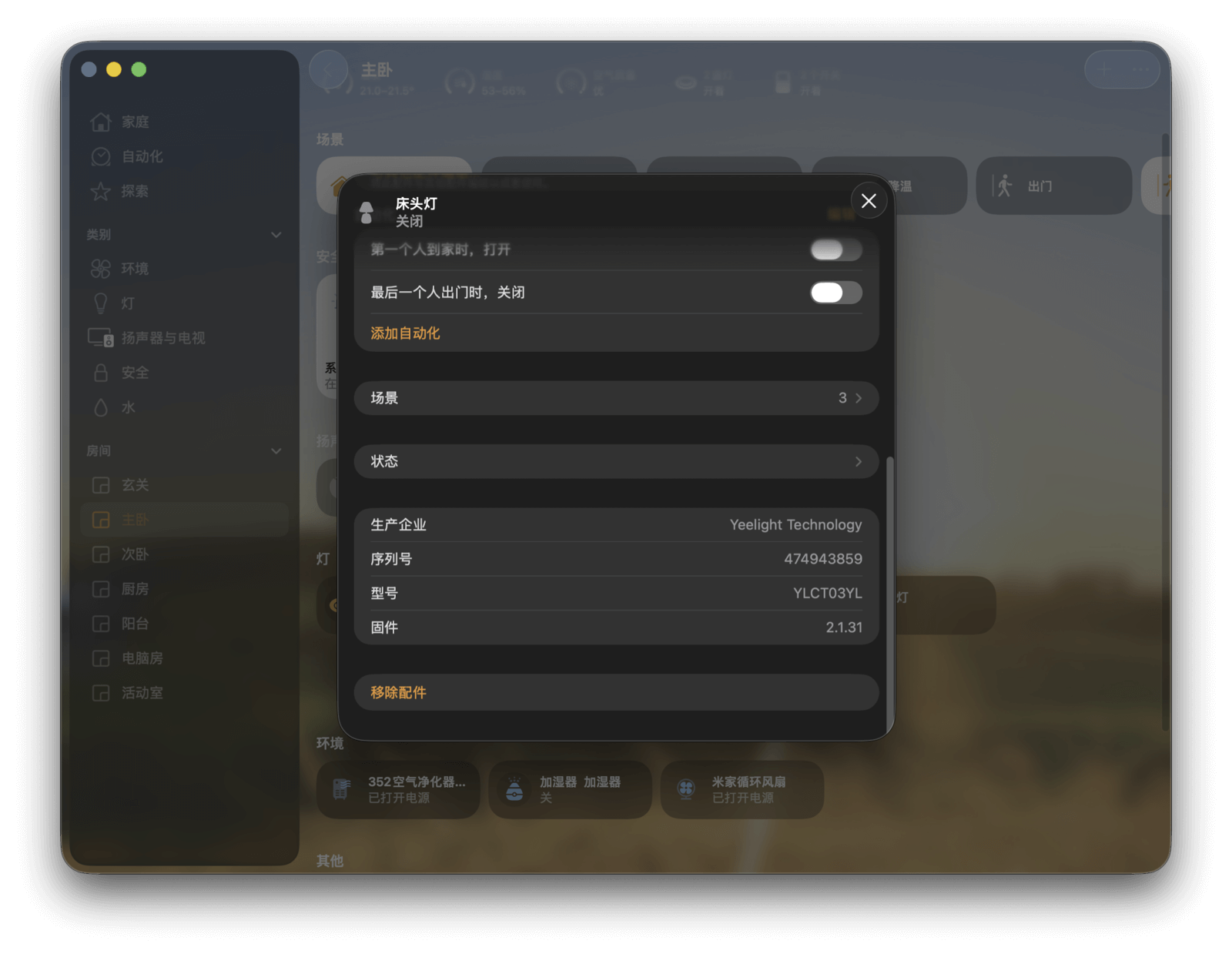 注意,如果是通过网关桥接的设备,底部是没有「移除配件」选项的。如果直接在家庭 app 中操作,你只能将网关本身连同其桥接的所有设备一并移除。若要单独移除网关下桥接的某个设备,则需要到设备对应的第三方 app 内操作。