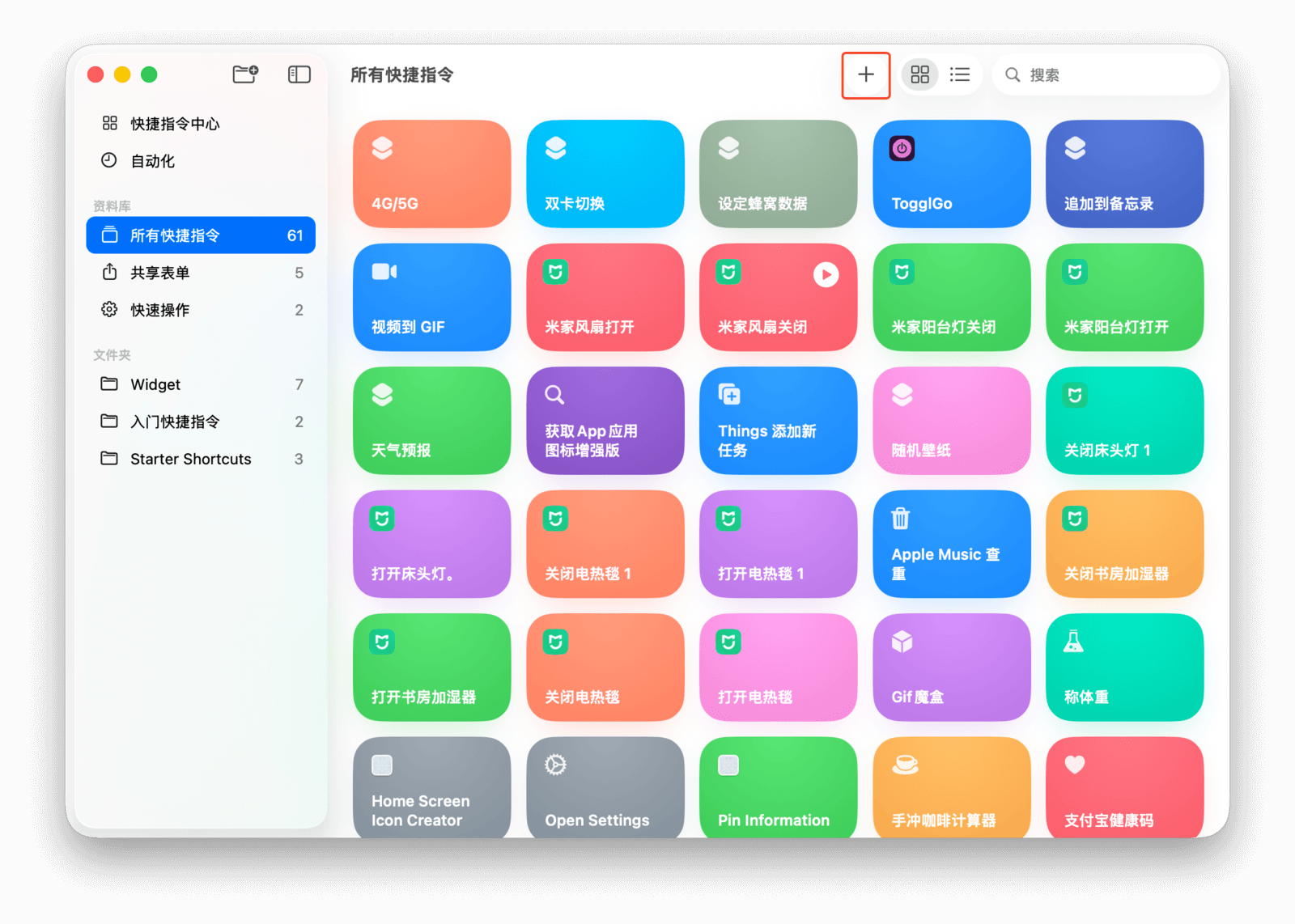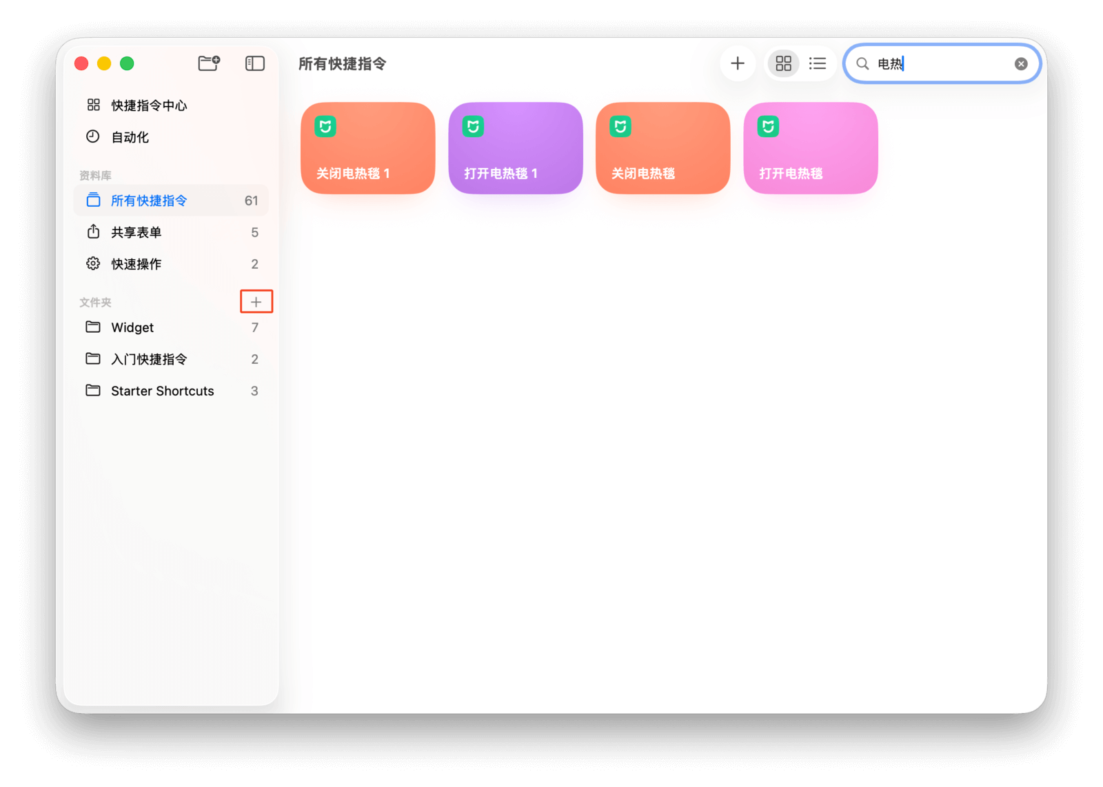 将鼠标悬停在「文件夹」上,右侧会出现一个「+」按钮,点击即可创建新文件夹。创建文件夹后,你就可以将快捷指令分门别类地存放了。