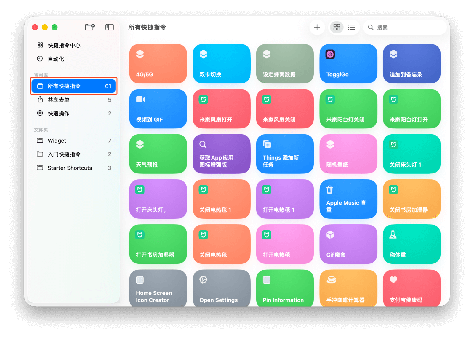 打开快捷指令应用,可以看到左侧边栏分为三个类别:快捷指令中心、快捷指令、文件夹。三者的基本界面如下所示,我们来逐一介绍。