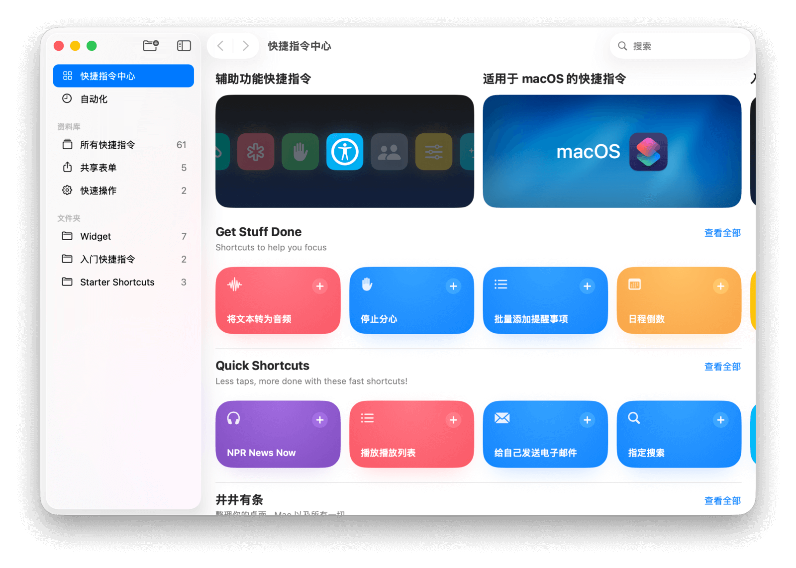 此外,你还可以浏览「适用于 macOS 的快捷指令」和「辅助功能快捷指令」。前者是专为 macOS 平台设计的快捷指令,后者则与系统的辅助功能相关。