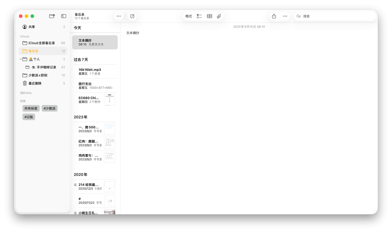 例如,我们刚才设置的过滤条件是「名称 包含 文本摘抄」,但其他人可能习惯用「随记」、「笔记」等词语来命名备忘录。