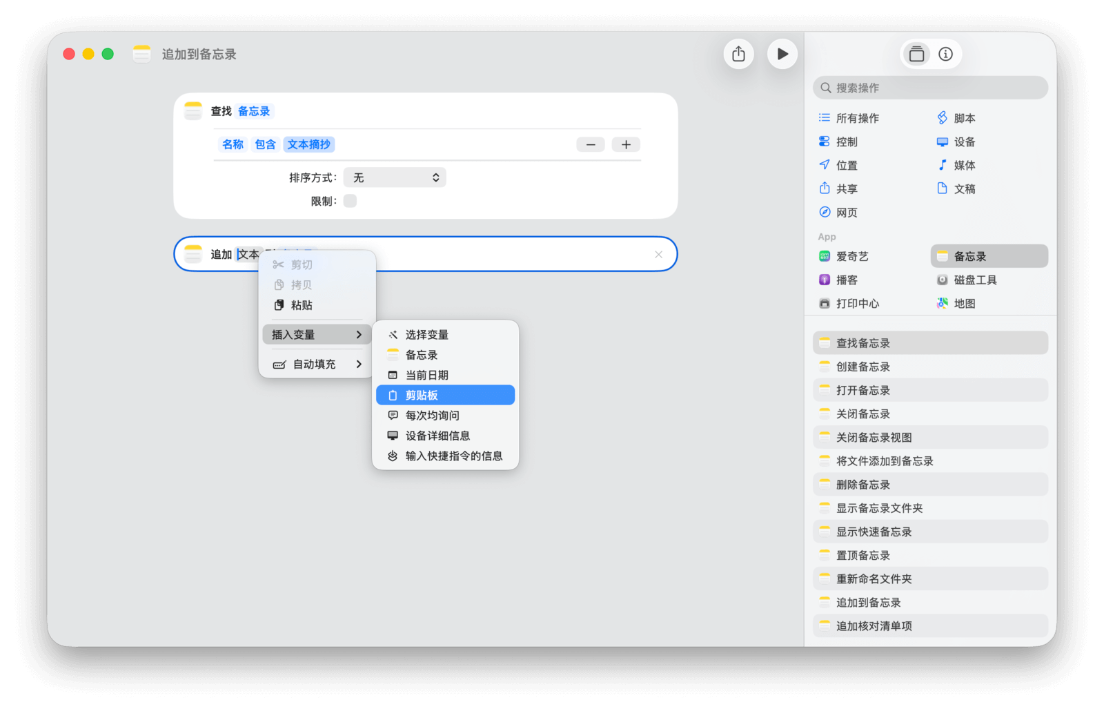 我们以制作「笔记摘抄」快捷指令为例,看看如何将剪贴板文本一键追加到备忘录中。