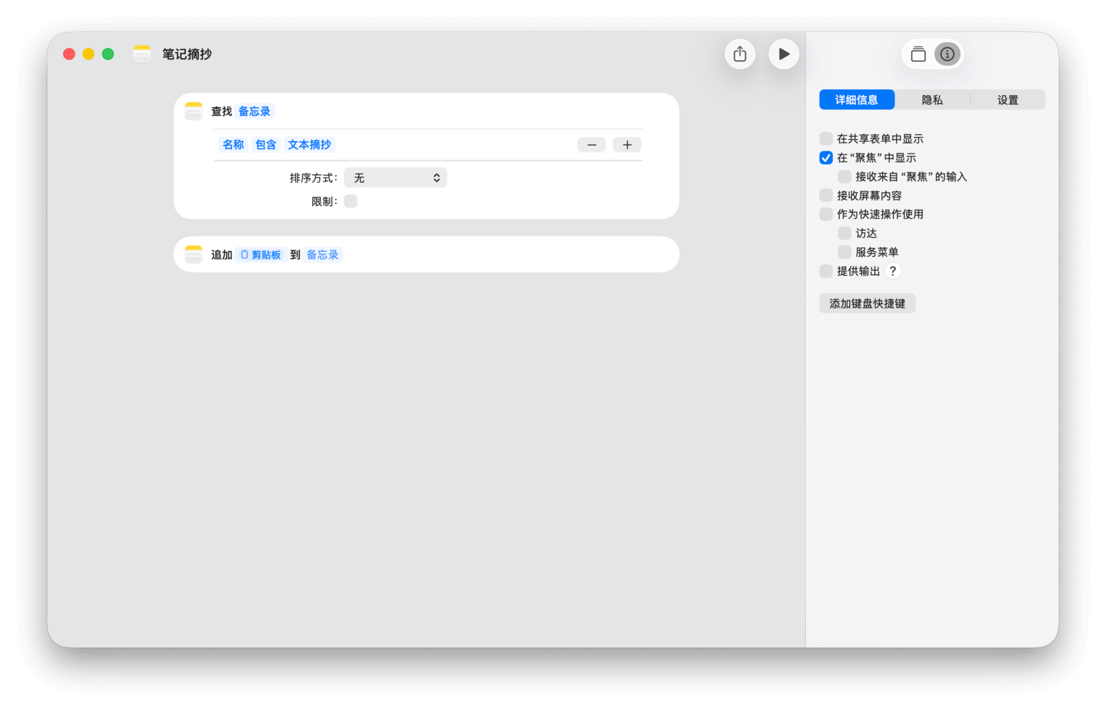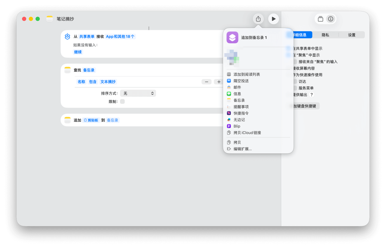 点击快捷指令编辑页面右上方的「i」图标,在「详细信息」界面中,可以看到「在菜单栏中固定」、「在共享表单中显示」、「作为快速操作使用」等选项。