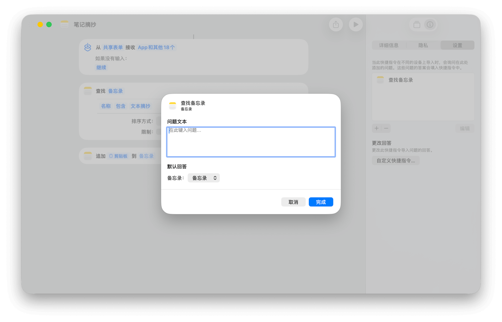 修改快捷指令后,再返回「导入问题」页面,此时就可以选择刚才的「文本」动作作为询问内容了。此处作为演示,我们将问题设为「你的摘抄备忘录的标题是什么?」,并将默认回答设为「文本摘抄」。