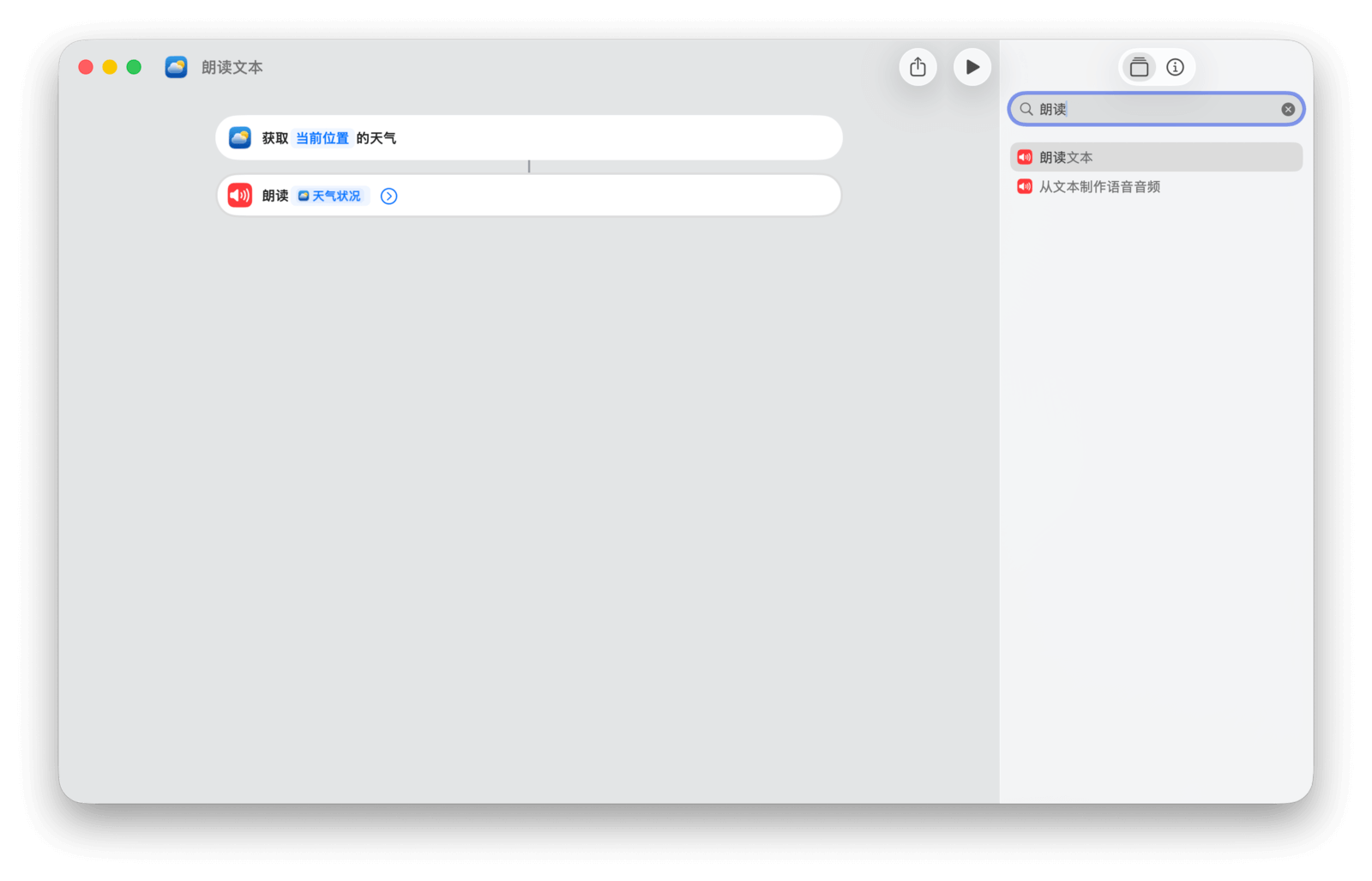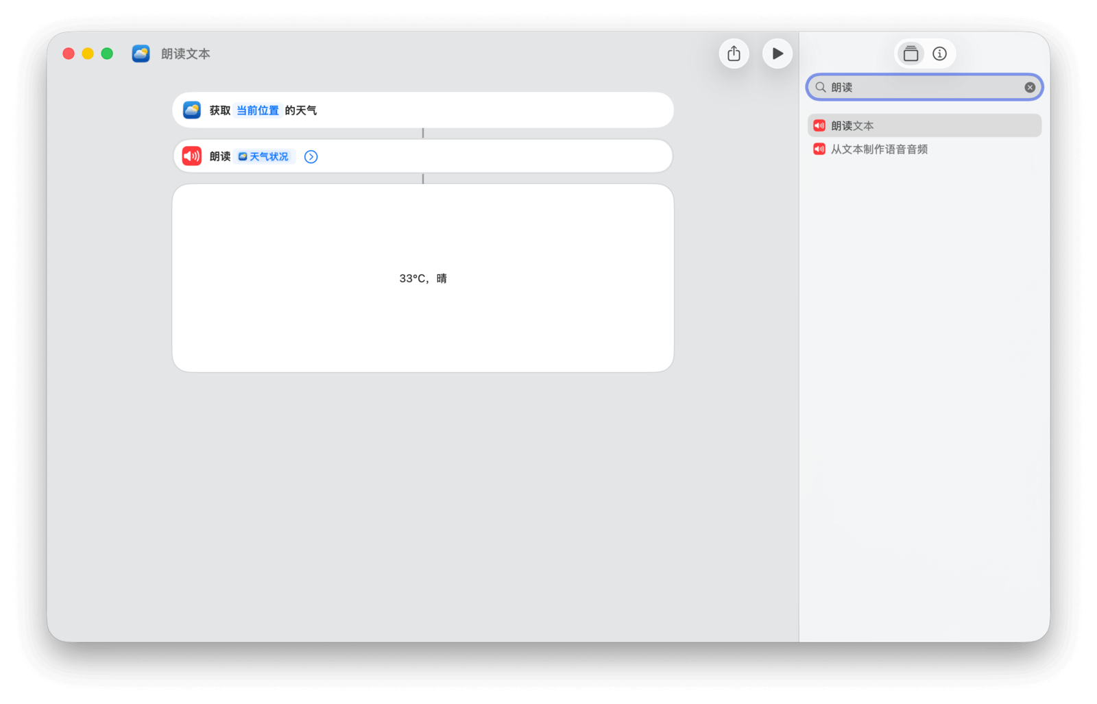 点击「▶」测试运行。如果网络正常且设备未静音,Siri 就会播报今日的天气情况。