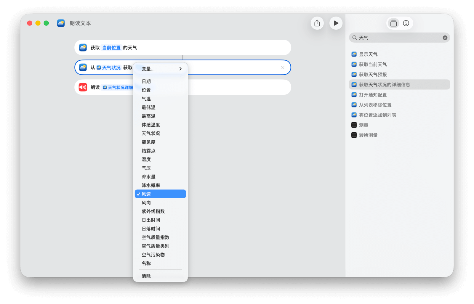 再次前往「App > 天气」,将「获取天气状况的详细信息」动作拖到「朗读」操作之前。默认获取的详细信息是「日期」,轻点它,将其改为「风速」。