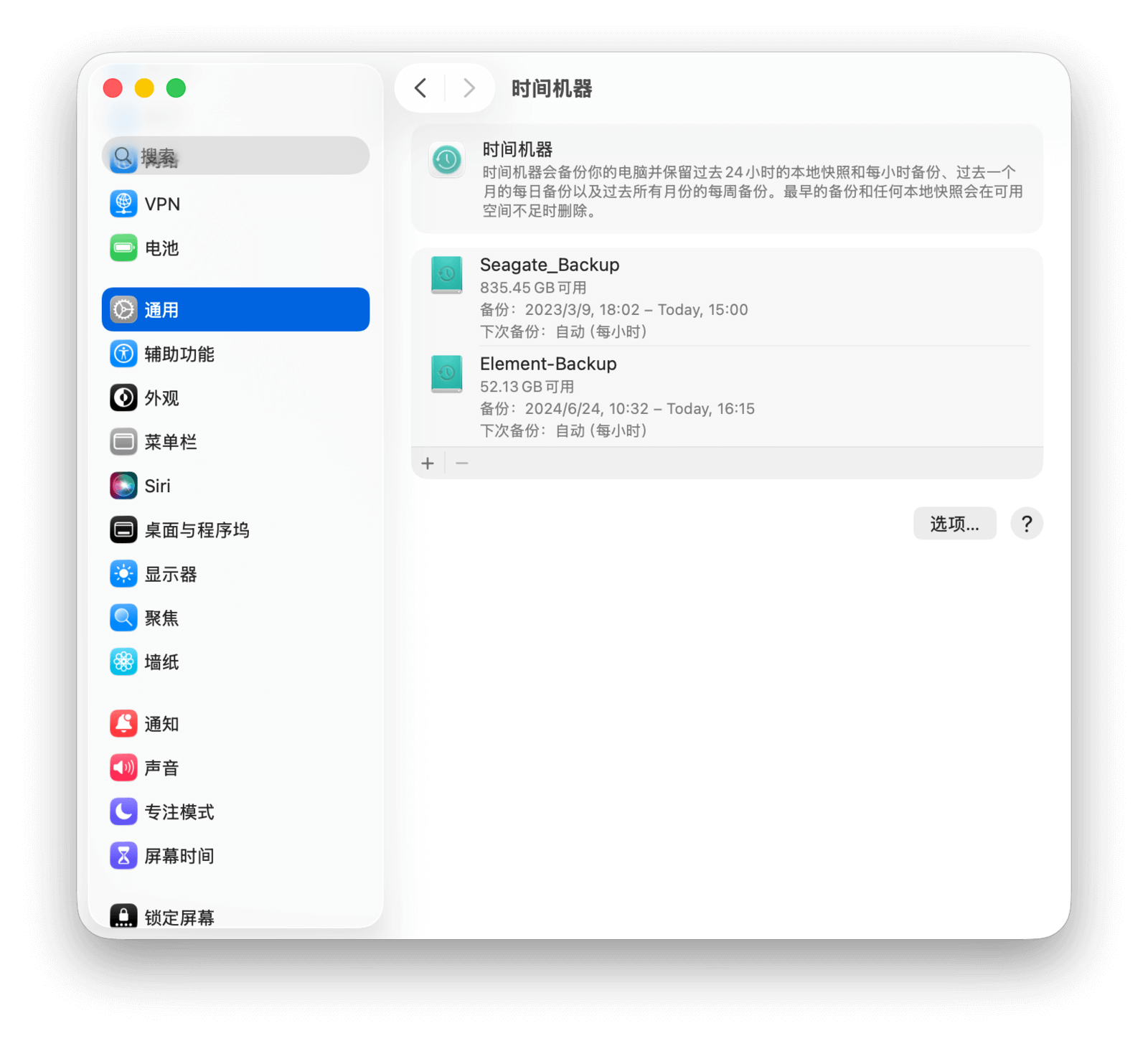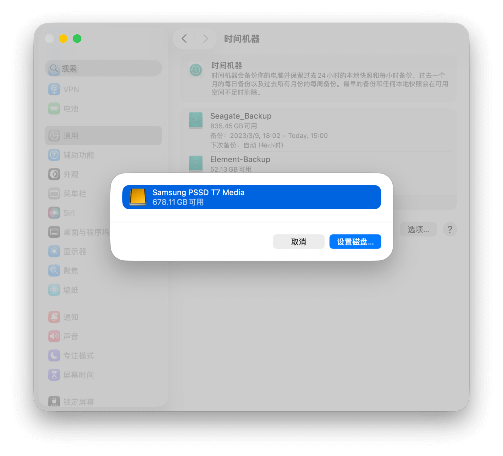 你可以在「系统设置 > 通用 > 时间机器」中找到并设置时间机器。