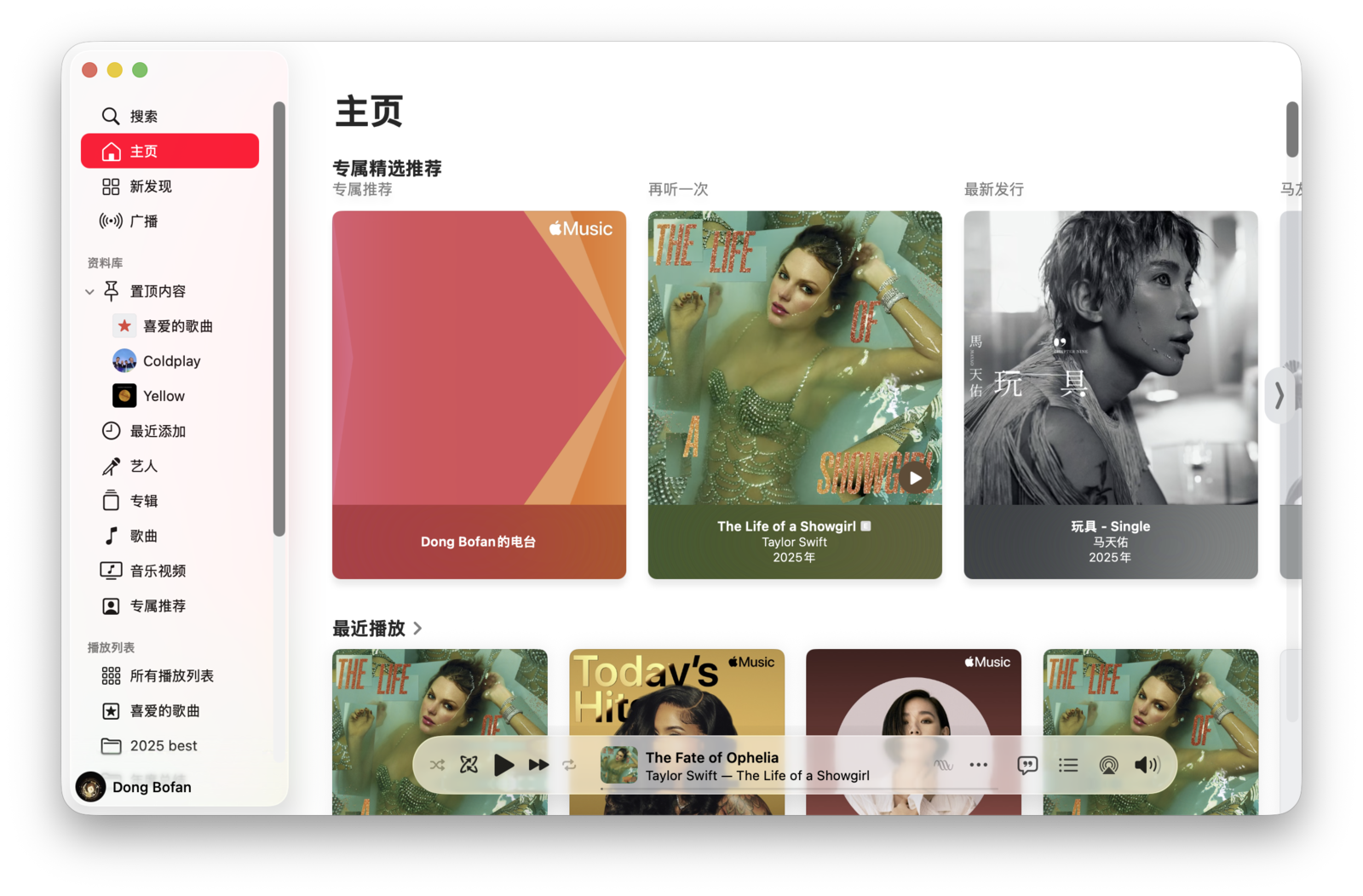 在「音乐」应用的侧边栏中,第一个标签页就是「现在就听」,里面包含了精选推荐、最近播放、专属推荐、新近发行、音乐回忆等各类歌单。