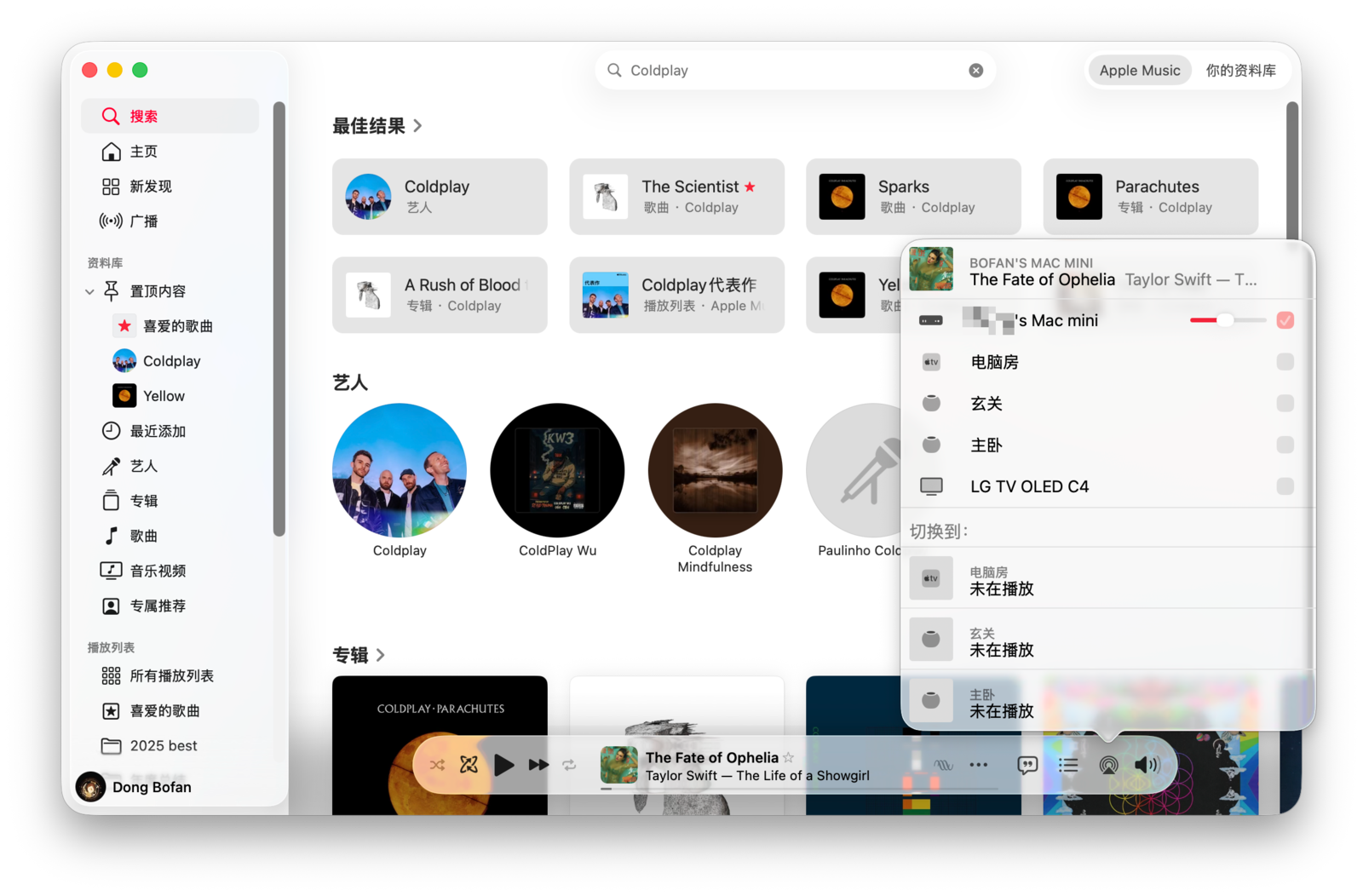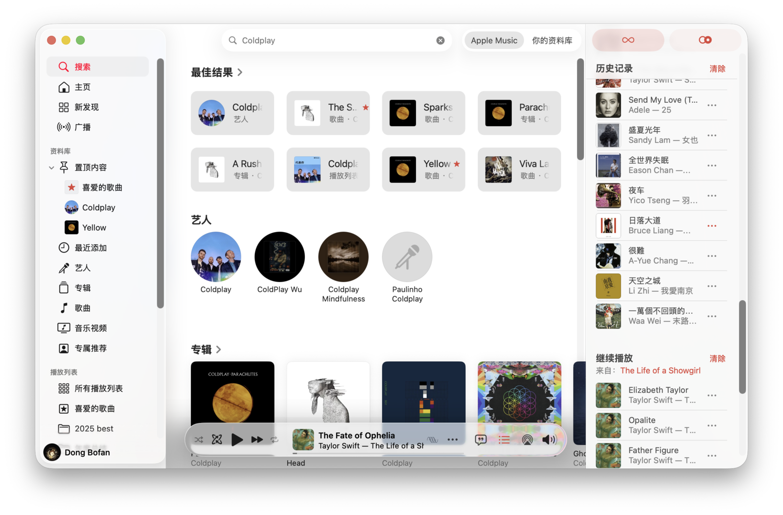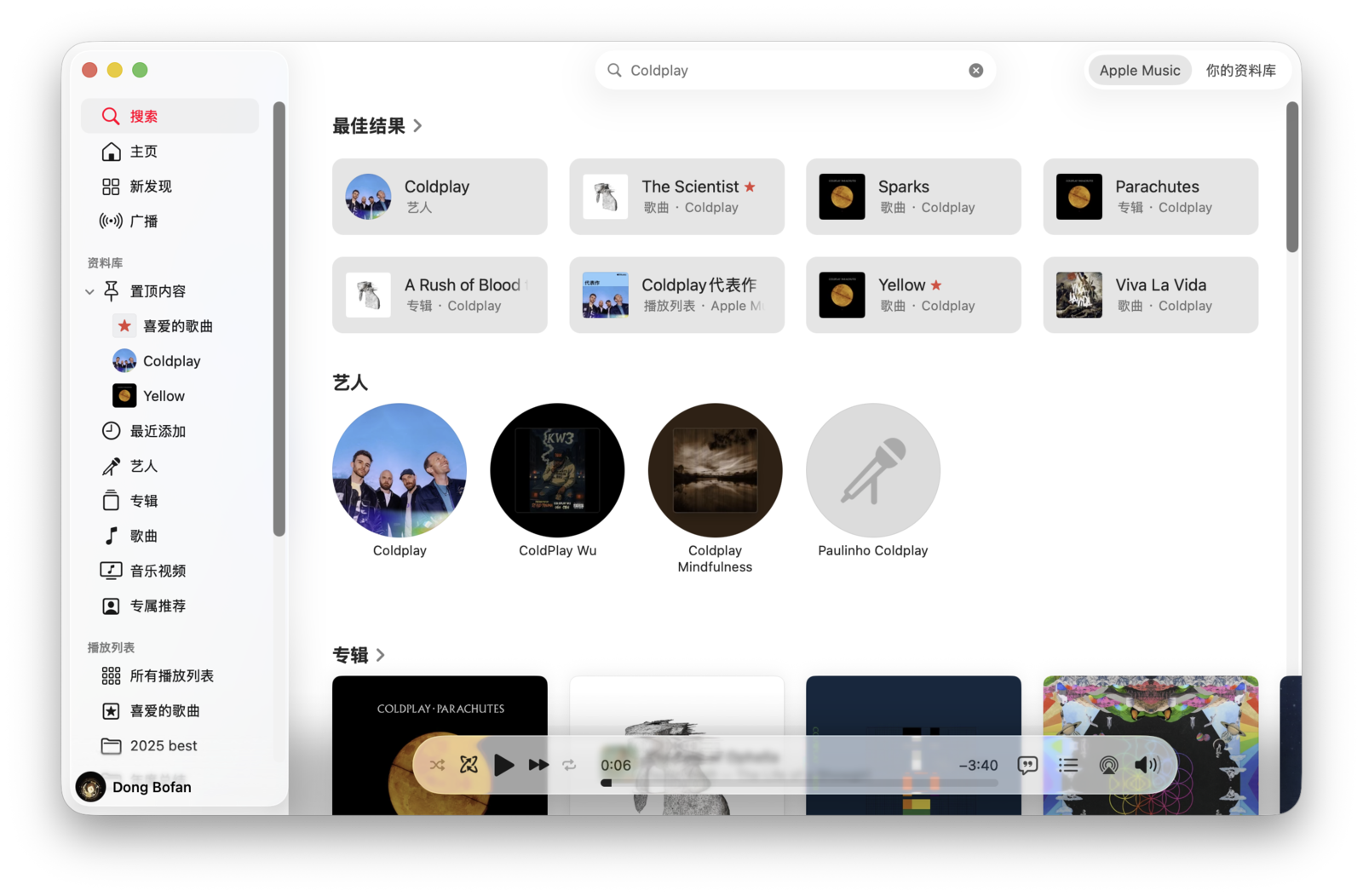 在「音乐」应用左侧边栏顶部是「搜索框」,支持搜索艺人、歌曲、歌词等内容。输入关键词后,搜索结果会分为「Apple Music」和「你的资料库」两类,前者是在整个曲库中搜索,后者则只在你已添加的资料库中搜索。当然,你也可以通过 Siri 来搜索音乐。