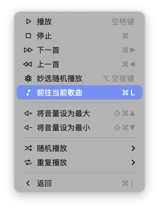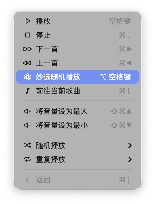 一种是「妙选随机播放」,Apple Music 会选取一首歌并播放与之完美搭配的其他歌曲。只需点击菜单栏的「控制 > 妙选随机播放」或使用快捷键「Option + 空格键」即可开启。
