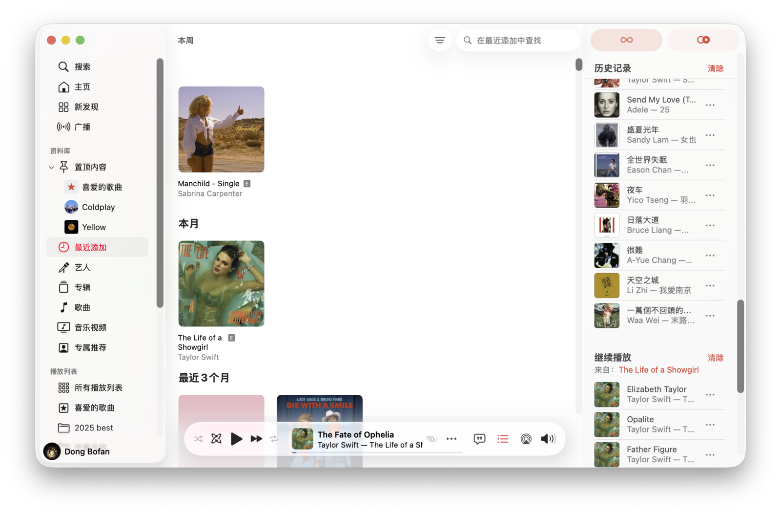 在侧边栏的资料库下,有「最近添加」「艺人」「专辑」「歌曲」等多个二级目录。