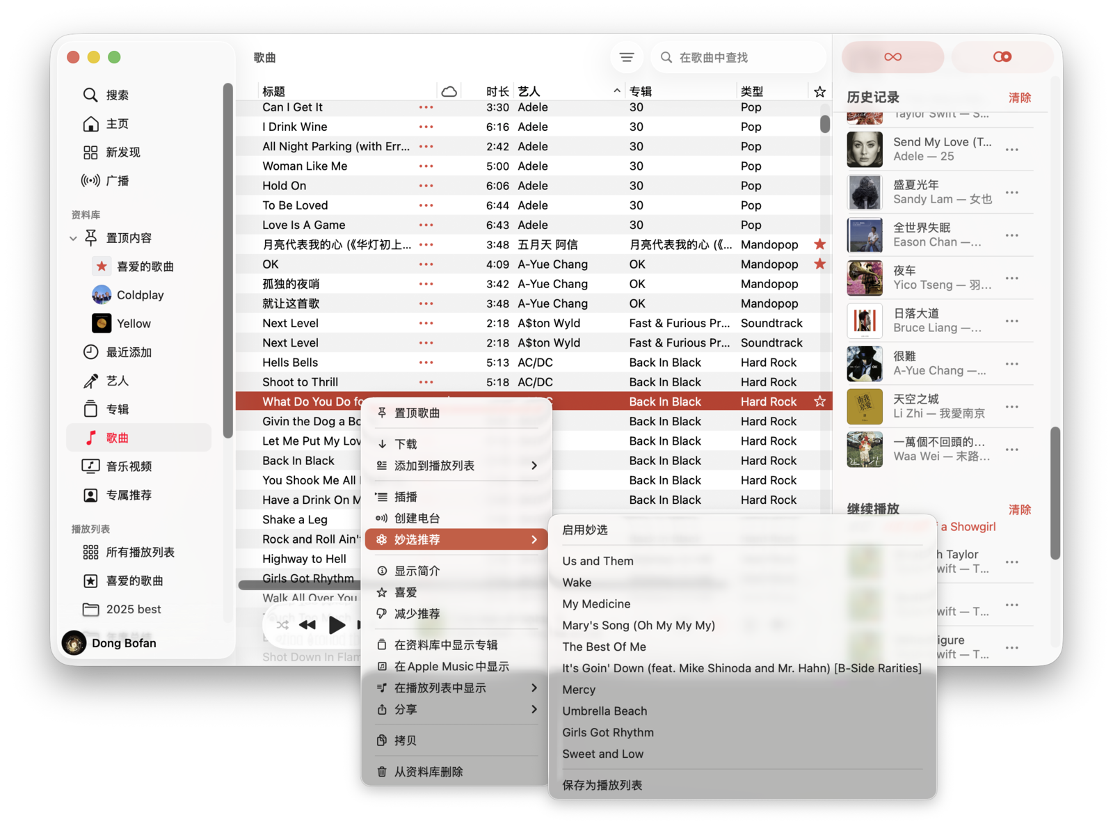 「播放列表」中,包含「待播清单」和「历史记录」。「历史记录」顾名思义,就是你播放过的歌曲;而「待播清单」则显示即将播放的歌曲队列,通常来自当前专辑或歌单。你可以控制播放顺序和模式,还支持「插播」其他歌曲。