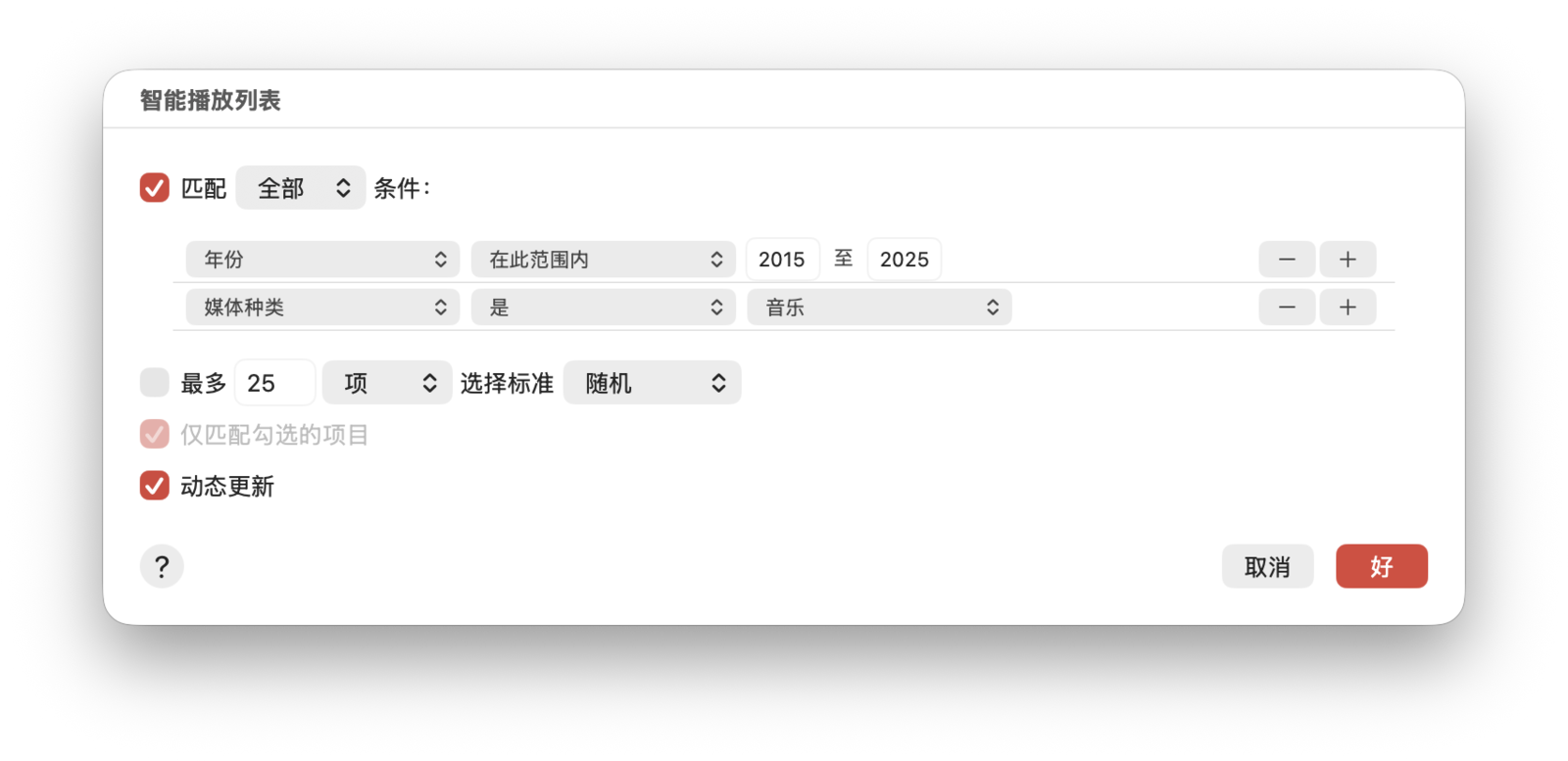 此外,你还可以创建「智能播放列表」,通过设定不同的规则和范围来自动筛选符合条件的歌曲。