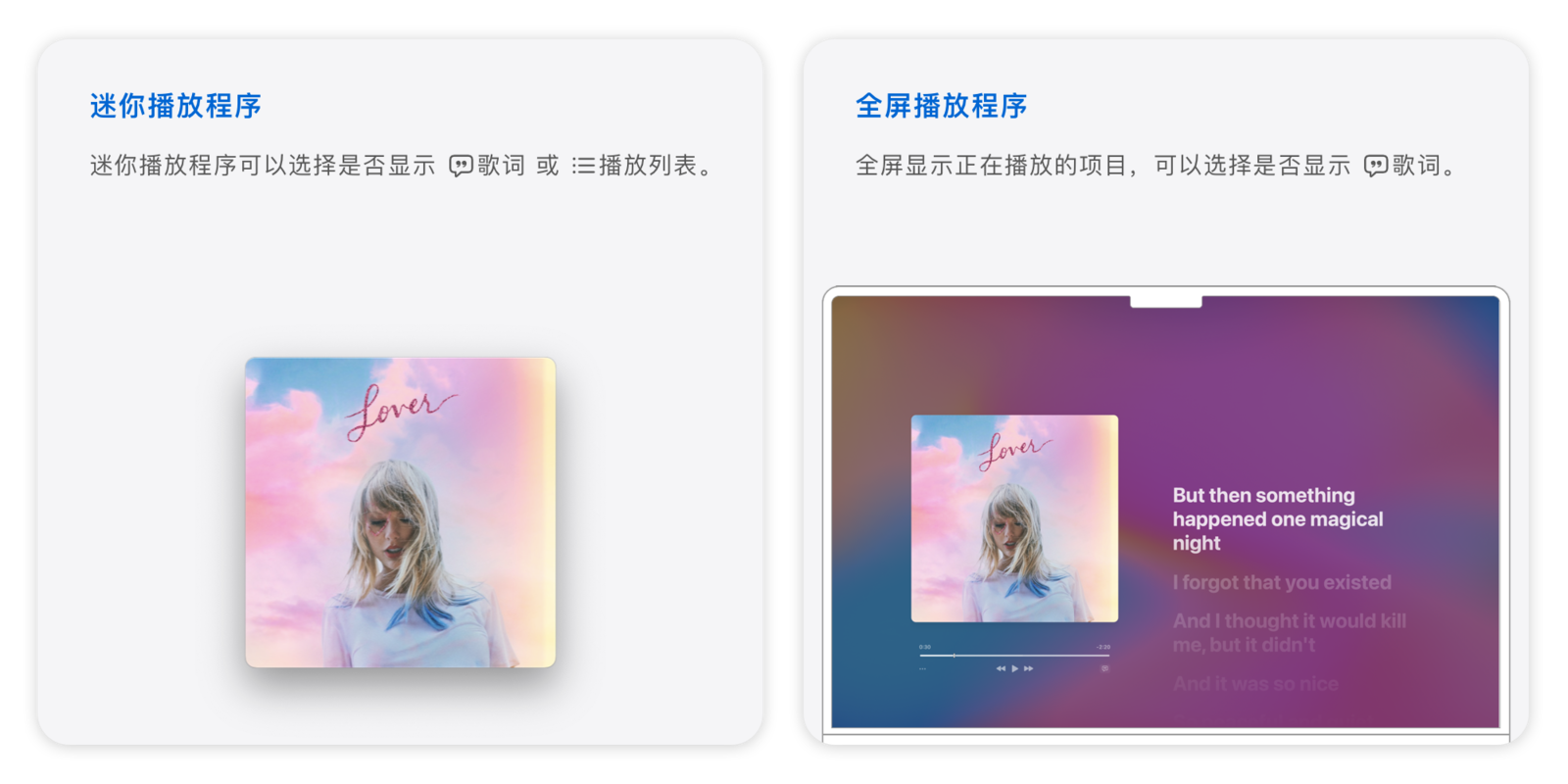 除了标准窗口,你还可以通过菜单栏的「窗口」切换到「迷你播放程序」或「全屏播放程序」。在「迷你播放程序」中,你还可以选择是否显示歌词和播放列表。