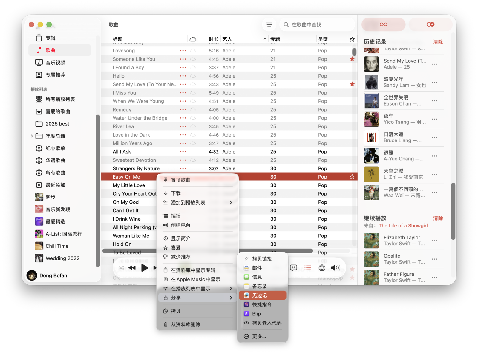 无论是歌曲、专辑、歌单还是电台,都可以点击「...」按钮,然后选择「分享」并发送到不同平台。与 iOS 不同的是,macOS 版本的分享选项只包括「拷贝链接」「电子邮件」「信息」「拷贝嵌入代码」,而没有「隔空投送」。