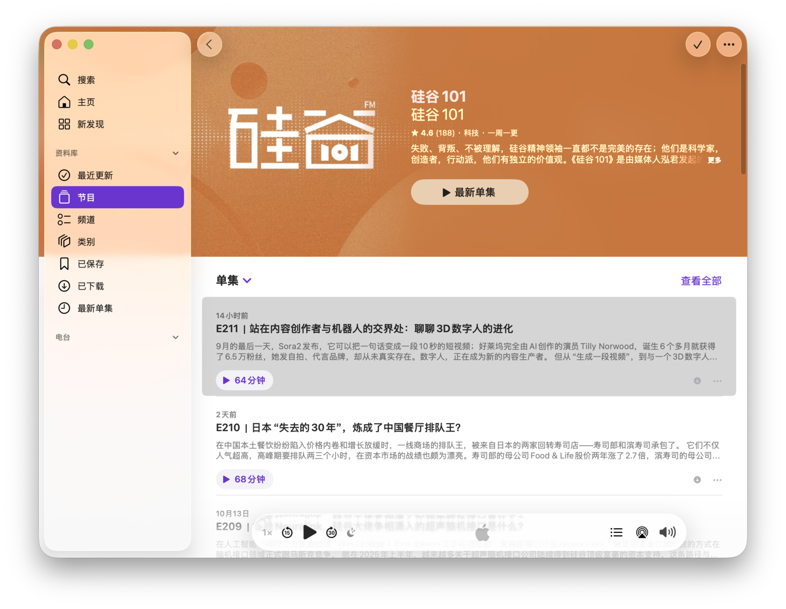 播客节目通常以单集(episode)为单位。如果用音乐 App 打比方:播客的频道(channel)相当于艺人,节目(show)相当于一张不断更新的专辑,而单集则相当于专辑中的一首歌曲。