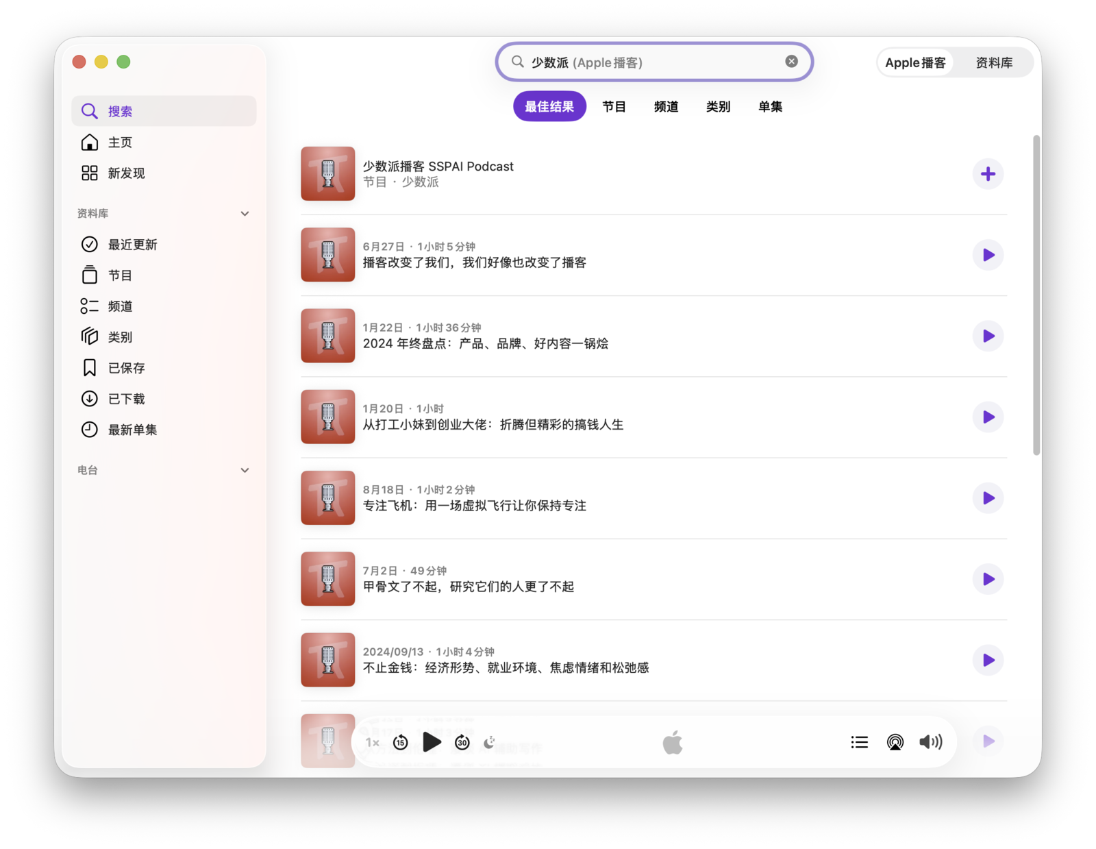 如果制作者没有提供链接,你也可以通过搜索或浏览来关注播客。在「播客」App 中,点击侧边栏的搜索按钮,并在输入框中键入关键词即可。