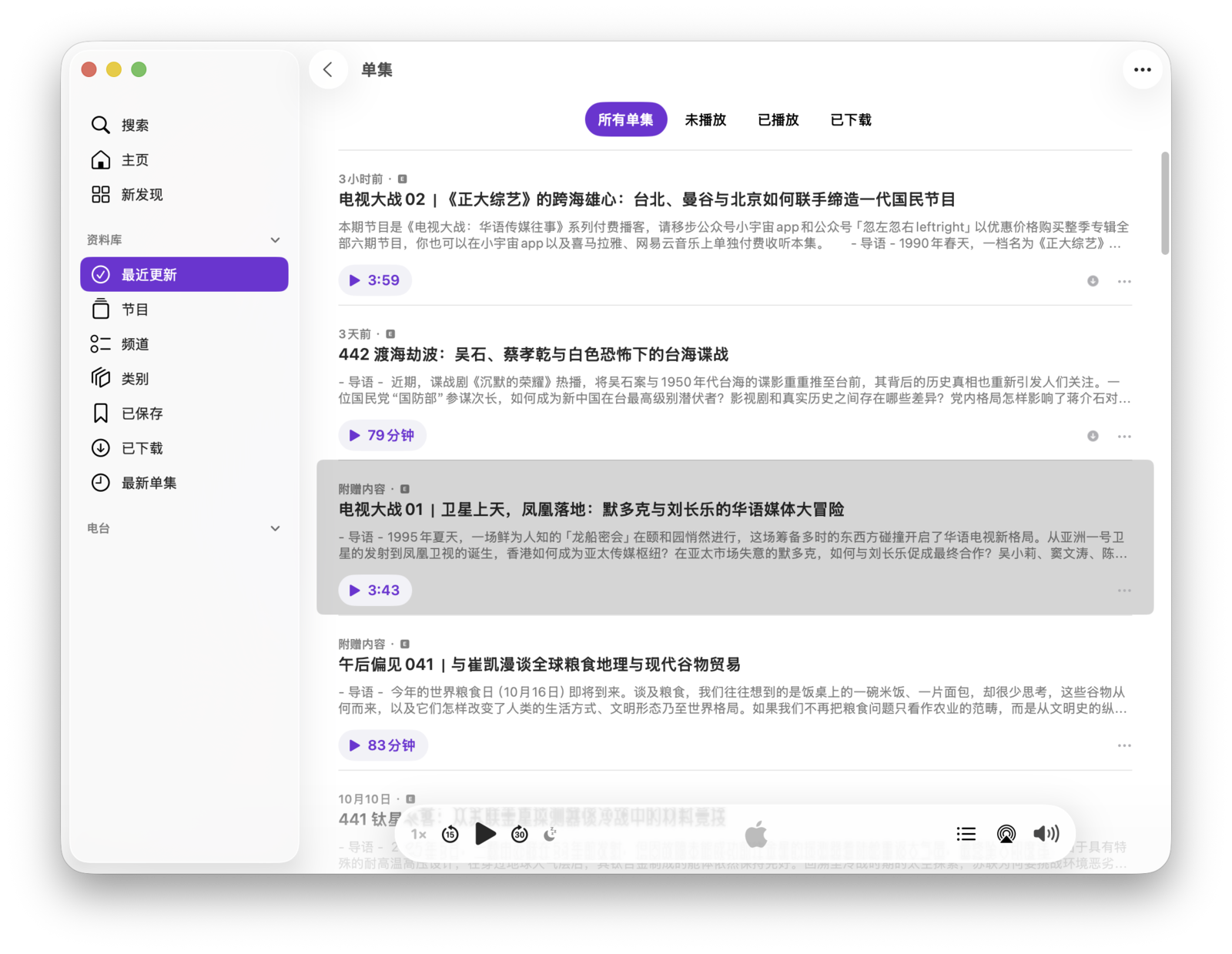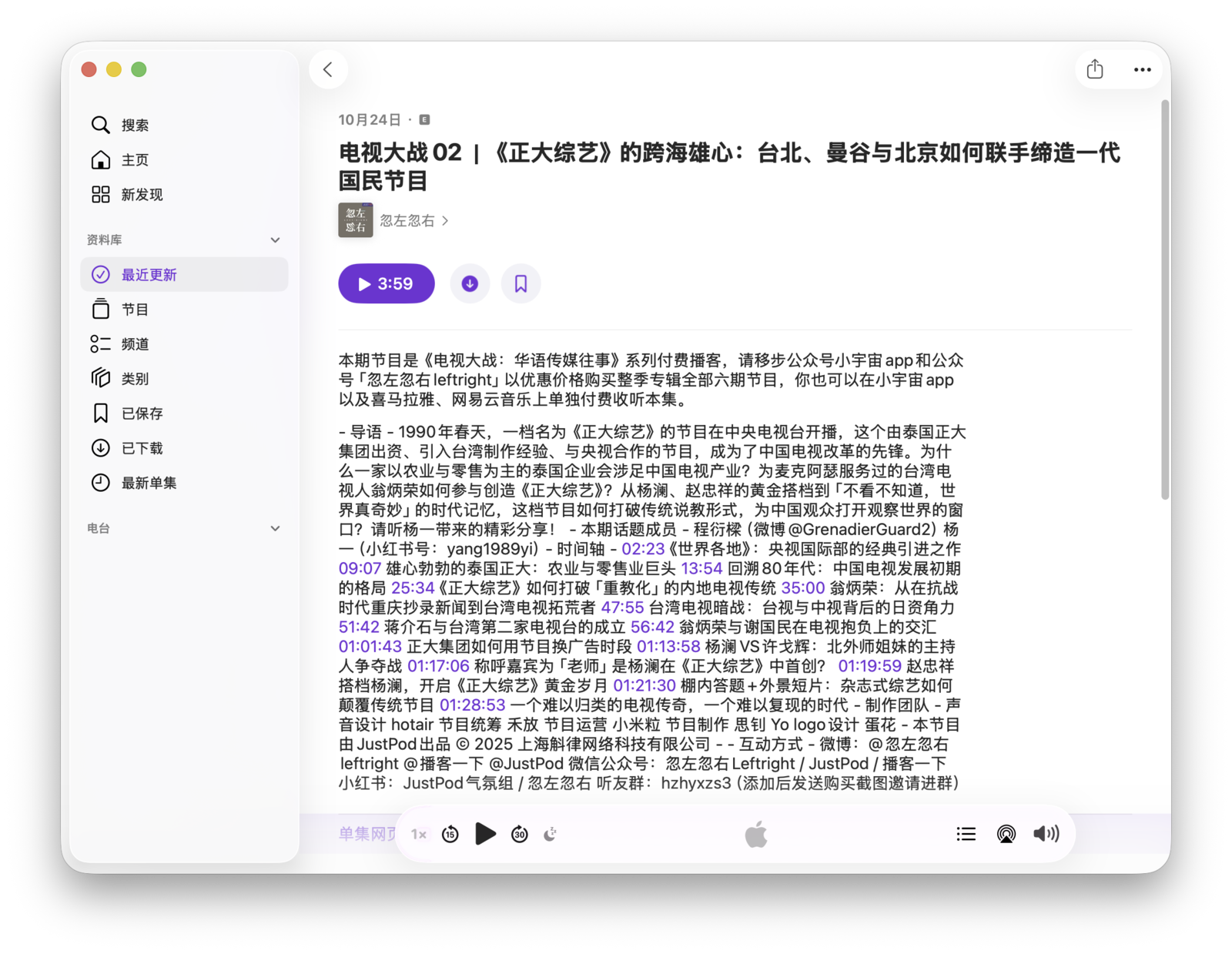 点击一个单集即可进入其介绍页面。要直接播放该单集,可以点击播放键。在单集介绍页面,可以看到由节目制作者提供的补充文字,其中可能包含链接和其他多媒体内容,这部分通常被称为「Shownotes」。