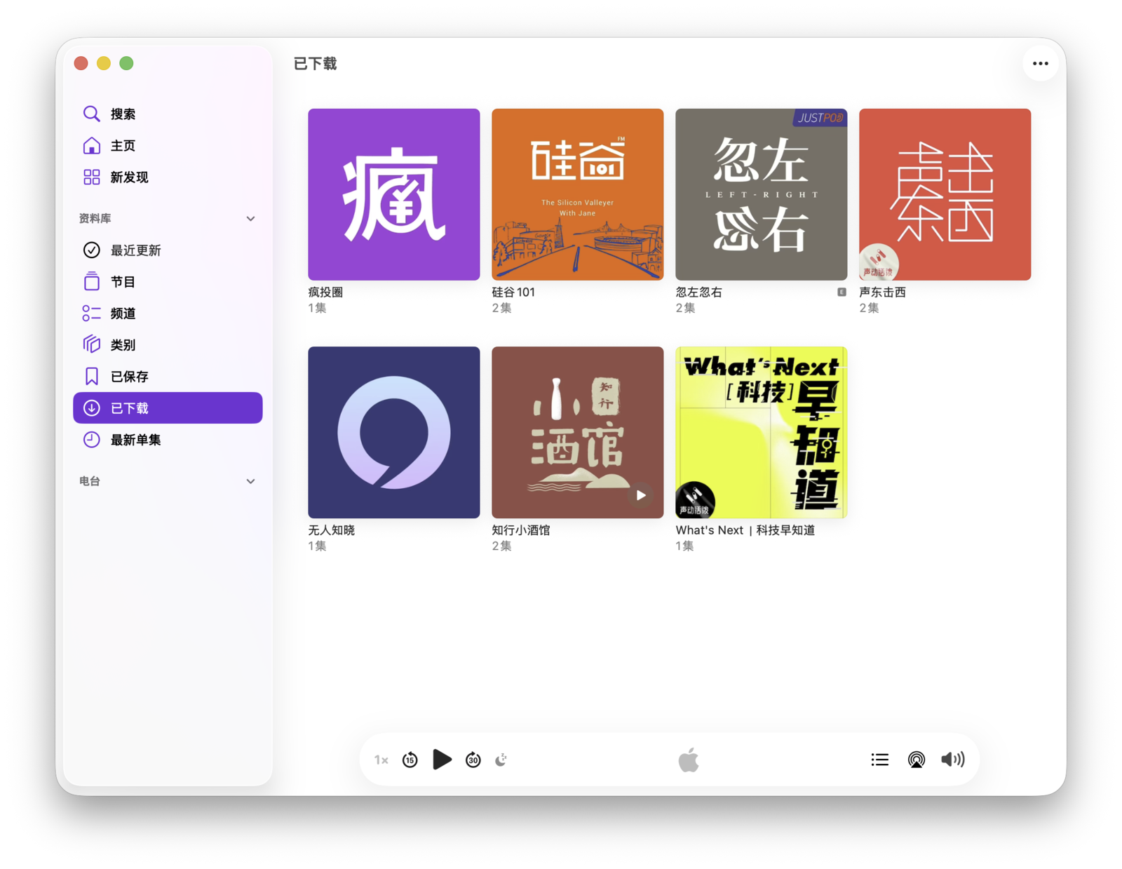 要查看已下载的单集,可以前往「播客」App 侧边栏的「资料库」面板,并点击「已下载」。