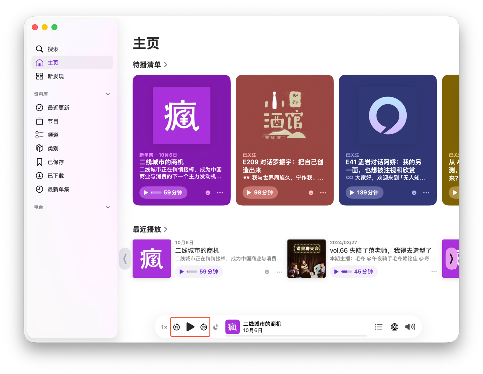 要查看已关注播客的最新单集,可以前往「播客」App 侧边栏的「资料库」面板,并点击「最近更新」。