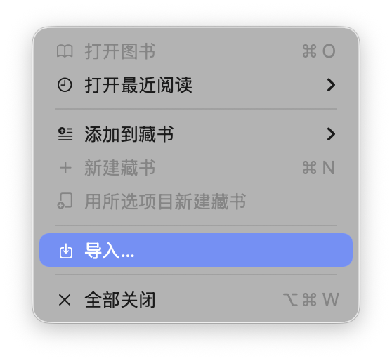 「图书」应用支持 EPUB 和 PDF 格式。如果你手头的文件是其他格式,可以考虑先使用 Calibre 等软件进行转换。你可以直接将本地文件拖入应用窗口,也可以通过菜单栏的「文件 > 导入...」来添加图书。