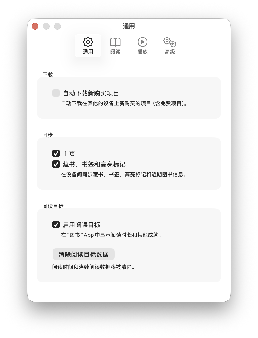导入图书后,如果你开启了 iCloud 同步功能,书库中的所有图书及阅读进度,都会自动同步到所有登录了同一 Apple ID 的设备上。要开启此功能,请在菜单栏依次点击「图书 > 设置...」,然后在「通用」窗口中勾选「阅读中」和「藏书、书签和高亮标记」两个同步选项。