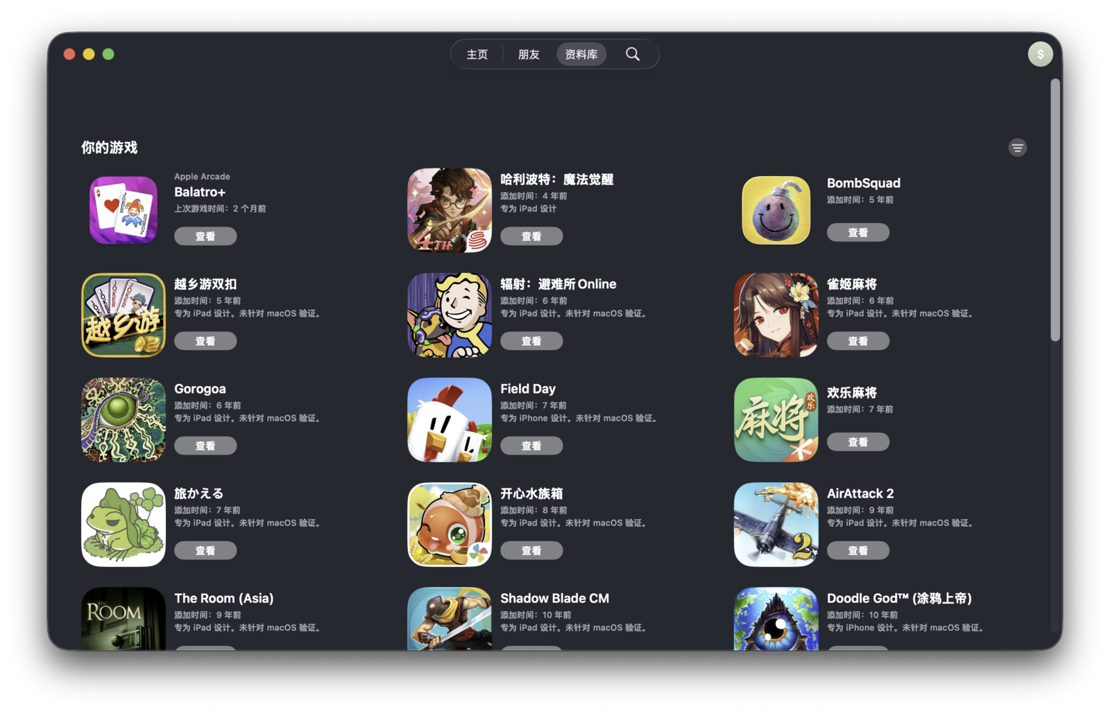 「资料库」标签页汇总了你账号下所有支持 Game Center 的游戏。在这里,你可以直接启动或重新下载游戏,也可以查看每个游戏已达成的成就。