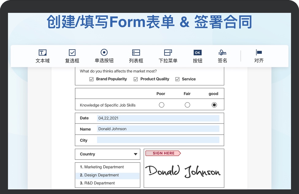 使用各种交互式表单控件创建可填写的 PDF 表单。随时随地在任何设备上轻松填写和签署 PDF 表格,包括商业表格、税务表格等。