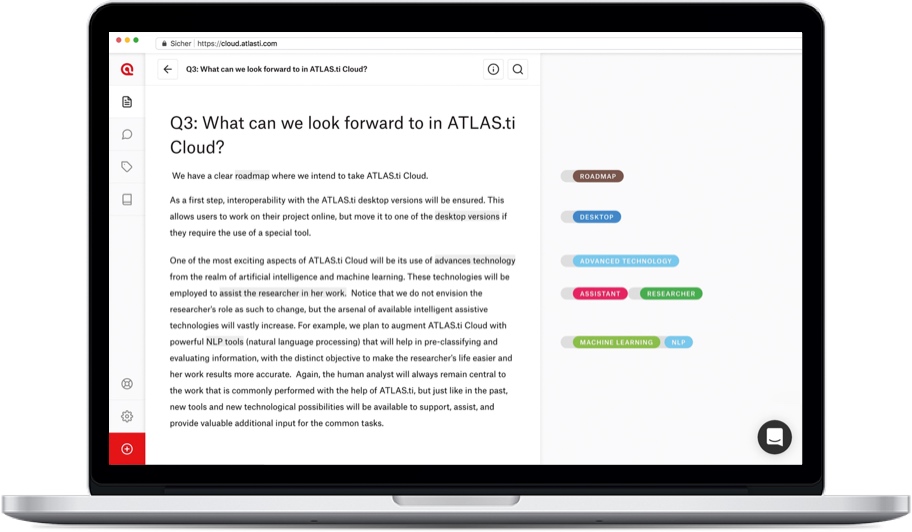 该互动边缘区域 是ATLAS.ti中一个独特的工作空间不被市场上的任何其他程序超越。它允许以独特直观的方式与您的数据进行交互,以数字方式传输数字世界中的传统纸笔类比。该报价水平 也从根本上独特的ATLAS.ti的。如果提供低于编码的分析水平,并且更好地支持归纳理论研究方法,如扎根理论,解释学,话语分析,知识社会学或现象学,而不是任何其他软件。关于ATLAS.ti 网络/可视化 功能,也可以这样说。它提供了最集成的数据处理方式,它是可视化和分析,数据组织以及概念级分析工作和数据表示的工具。由于ATLAS.ti管理数据的方式,它允许处理 比其他产品更大的项目:ATLAS.ti处理包含数千个文档和/或数万个编码数据段的项目。
